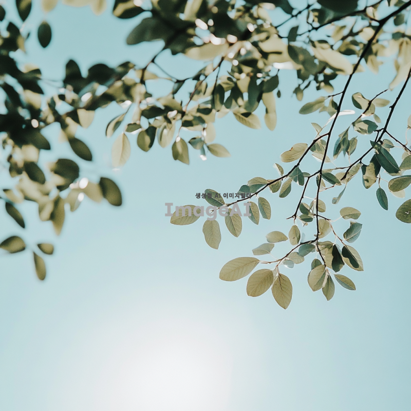 푸른 하늘을 배경으로 한 나뭇가지의 클로즈업 이미지, 나뭇잎이 촘촘히 달려 있으며 햇빛이 잎 사이로 부드럽게 비치는 모습, 자연의 생동감과 신선함을 강조, 바람에 살짝 흔들리는 듯한 느낌, 고해상도로 세밀한 질감 표현