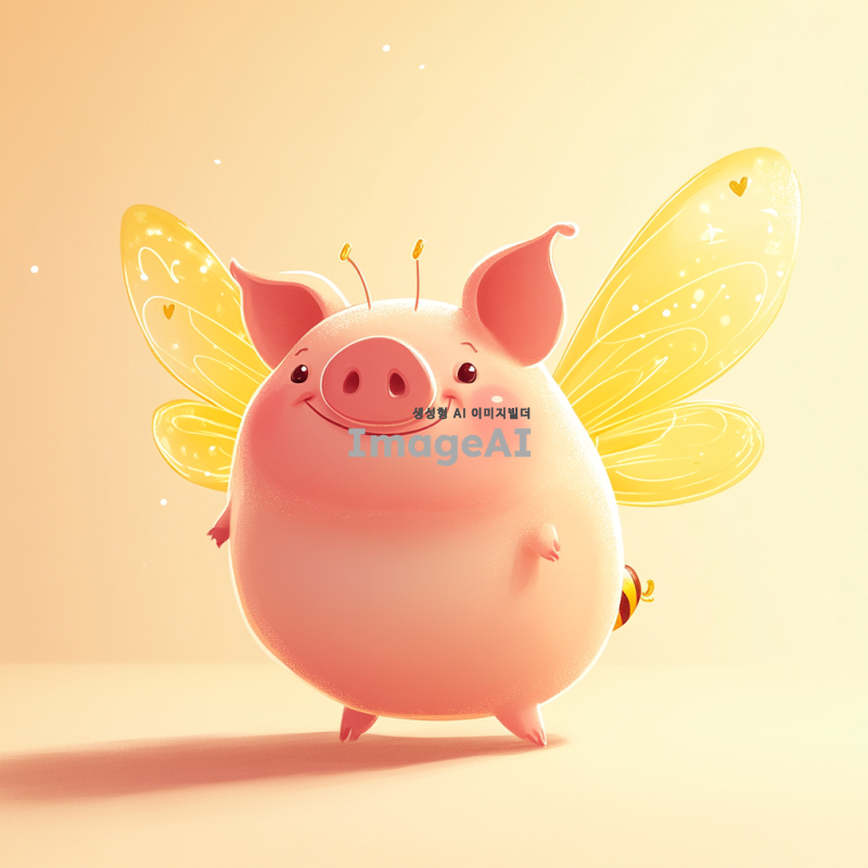 2D 스타일로 그려진 귀엽고 풍자적인 꿀돼지 캐리커쳐, 밝고 유머러스한 분위기, 돼지가 꿀벌의 날개를 달고 있는 모습, 돼지의 얼굴은 웃고 있고 눈은 반짝임, 배경은 단순하고 파스텔 톤, 돼지의 몸은 통통하고 부드러운 곡선으로 표현, 돼지의 피부는 분홍색, 꿀벌의 날개는 투명하고 노란색 줄무늬가 있음.