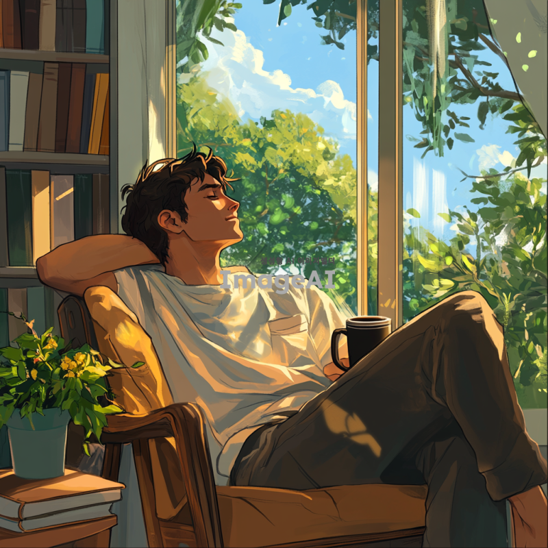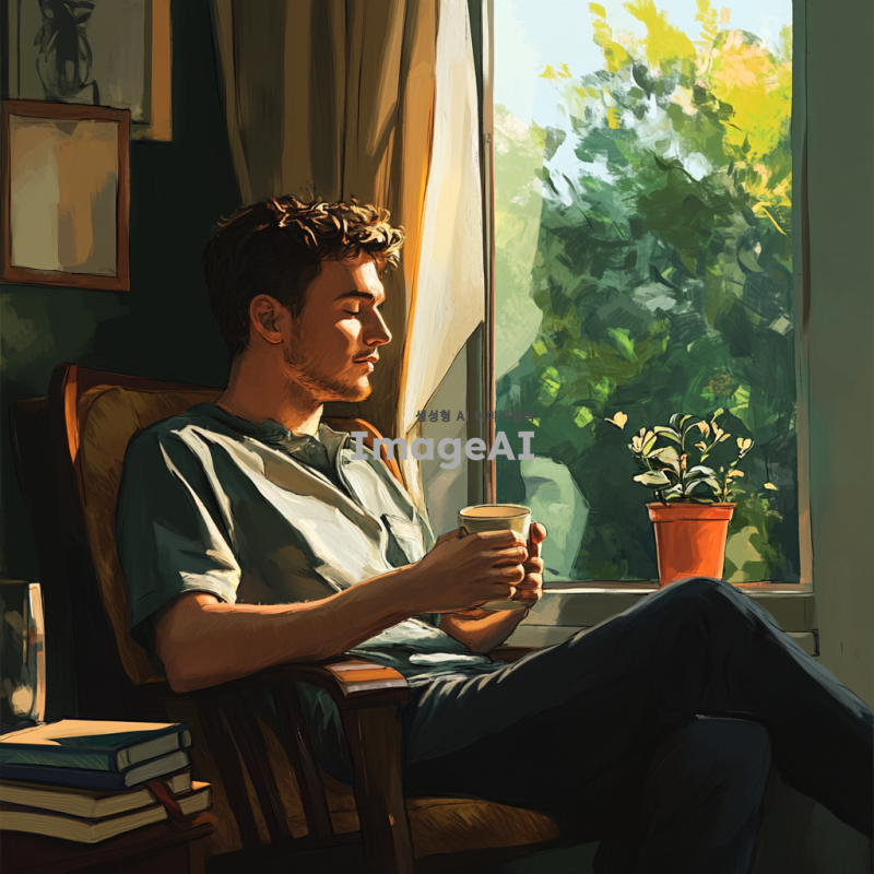 따뜻한 아침 햇살이 비치는 창가에 앉아 있는 남자, 편안한 의자에 기댄 채로 커피잔을 손에 들고 있다. 남자의 표정은 여유롭고 만족스러우며, 그의 주변에는 책과 작은 화분이 놓여 있다. 캐주얼한 셔츠를 입고 있으며, 창밖으로는 초록빛 나무와 푸른 하늘이 보인다. 분위기는 아늑하고 평화롭다.