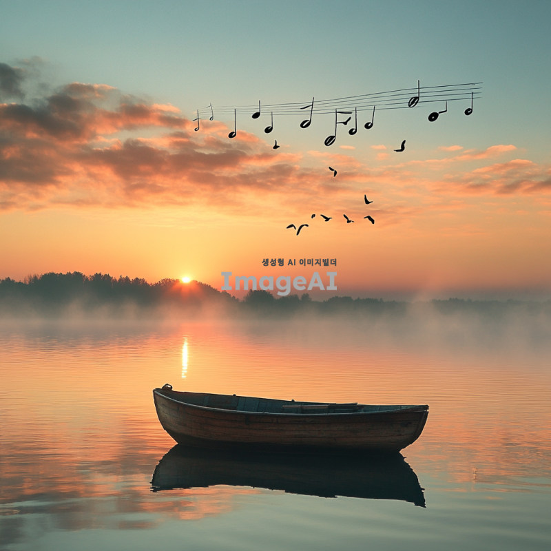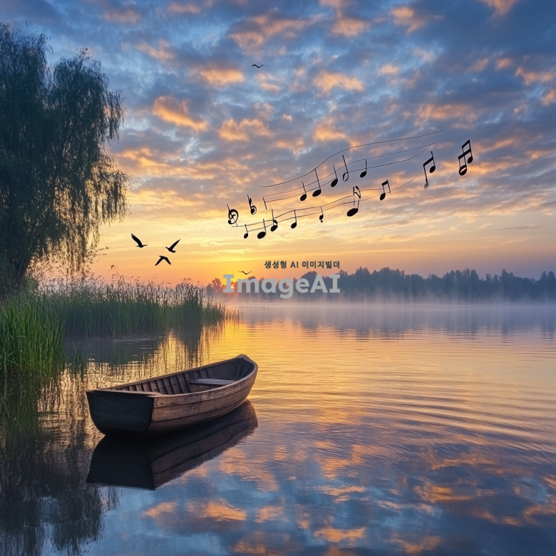 평화로운 자연 풍경, 부드러운 색감의 일출, 잔잔한 호수와 그 위에 떠 있는 작은 나무 배, 새들이 하늘을 날고 있는 모습, 낮은 구름과 함께 어우러진 고요한 아침 분위기, 음악적 요소를 암시하는 음표 모양의 구름.