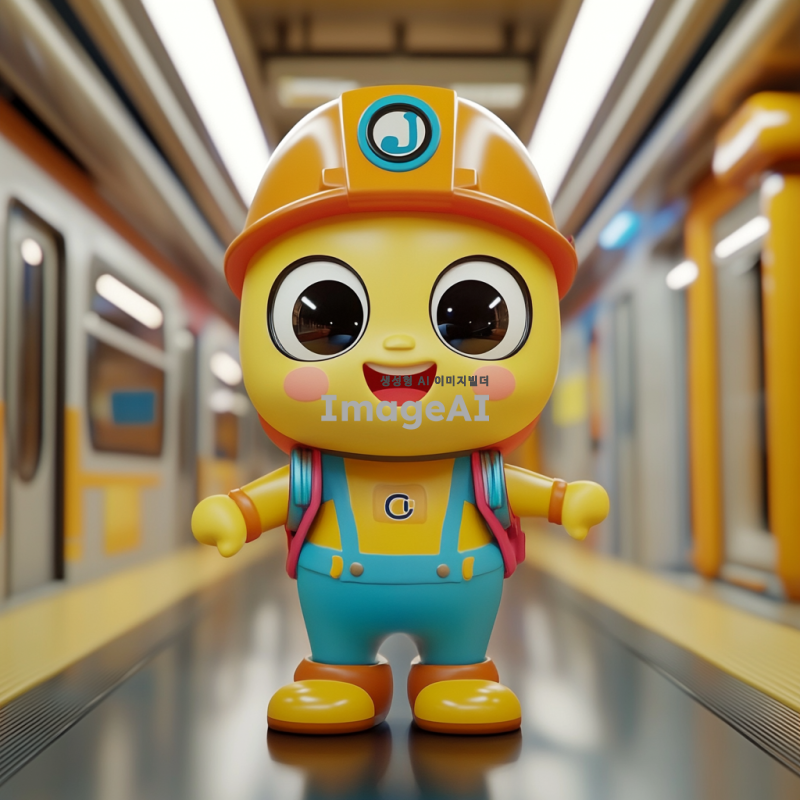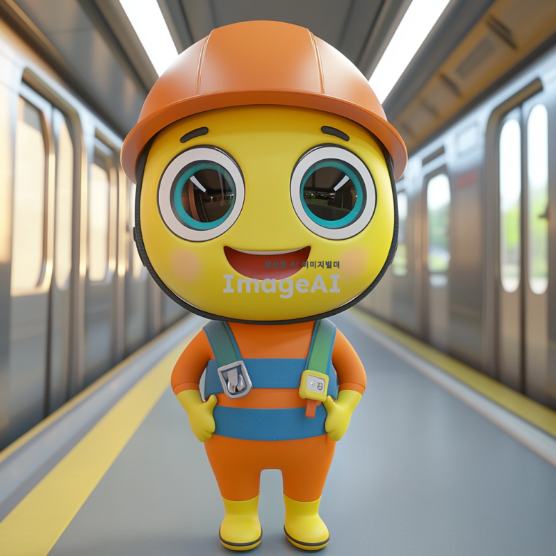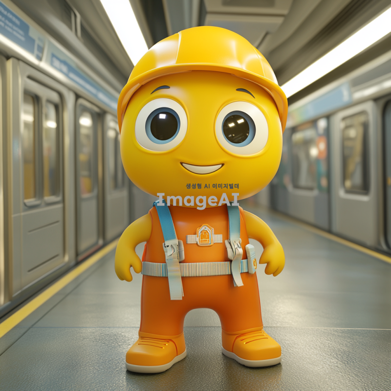 밝고 친근한 지하철 캐릭터, 큰 눈과 웃는 얼굴, 다채로운 색상의 몸체, 어린이들이 쉽게 기억할 수 있는 간단한 디자인, 안전모와 안전벨트를 착용한 모습, 지하철 내부와 외부에서 안전하게 행동하는 장면, 캐릭터가 어린이들에게 안전 수칙을 설명하는 상황, 밝고 교육적인 분위기, 현대적이고 깨끗한 지하철 배경.