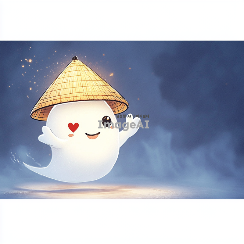 베트남 전통모자인 논라를 쓰고 있는 귀여운 유령, 손가락으로 하트 표시를 하고 있는 모습, 밝고 친근한 분위기, 부드러운 색조와 아기자기한 스타일, 배경은 가벼운 안개가 깔린 밤하늘, 유령의 몸은 반투명하고 은은하게 빛나는 느낌.