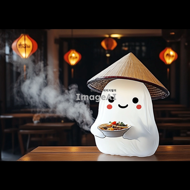 귀여운 유령이 베트남 전통모자인 논 라를 쓰고 앉아 쌀국수를 즐기고 있는 모습. 유령은 투명하고 반짝이는 외형을 가지고 있으며, 주변에는 아늑하고 따뜻한 분위기의 베트남 식당이 배경으로 자리잡고 있다. 쌀국수의 향긋한 김이 피어오르고, 유령의 표정은 행복하고 만족스러운 느낌을 주며, 식당 내부는 전통적인 베트남 장식품들로 꾸며져 있다.