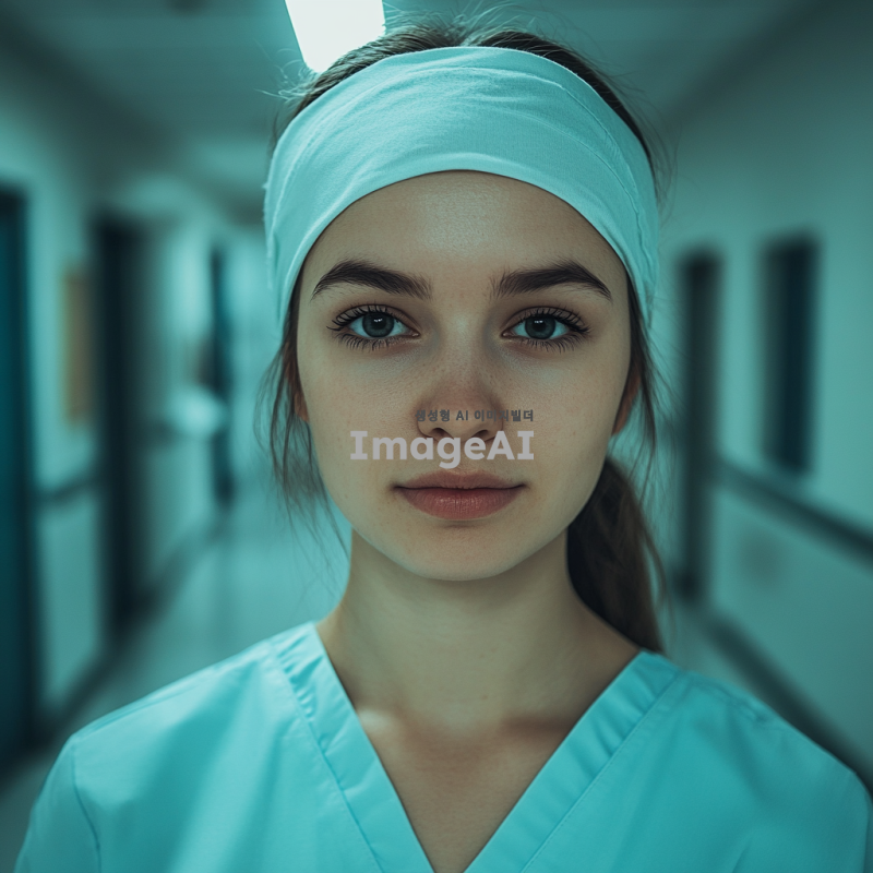 젊은 여성 간호사가 당황한 표정을 짓고 있는 모습, 놀란 분위기, 병원 배경.