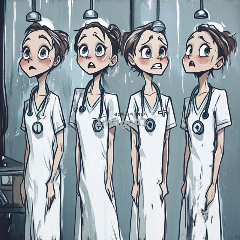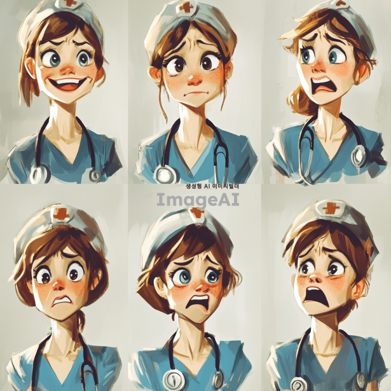 여자 간호사가 다양한 감정을 표현하는 그림 같은 사진, 응급실 배경, 귀여운 그림체, 웃는 모습의 간호사, 우는 모습의 간호사, 화난 모습의 간호사, 당황한 모습의 간호사.