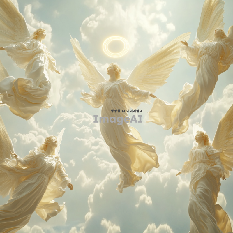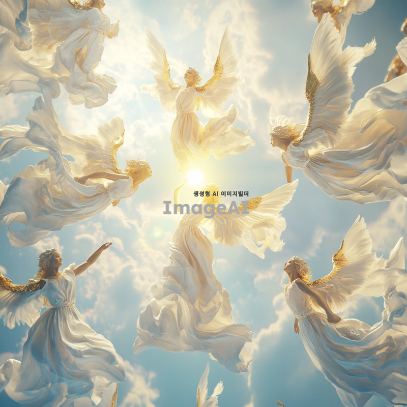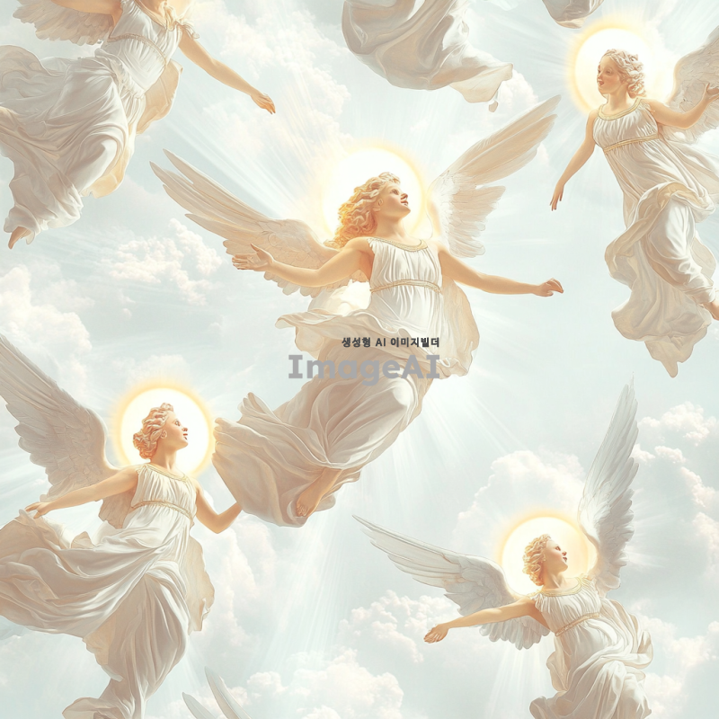하늘을 배경으로 다양한 천사들이 날아다니는 장면, 각 천사는 하얀색 깃털이 달린 날개를 가지고 있으며, 빛나는 후광이 머리 위에 떠 있는 모습, 천사들의 옷은 고전적인 그리스 로마 스타일의 드레이프가 있는 하얀색 천으로 되어 있고, 하늘은 밝고 맑으며 구름이 부드럽게 흩어져 있는 장면, 천사들은 평화롭고 행복한 표정을 짓고 있으며, 주변에는 부드러운 빛의 효과가 강조된 장면