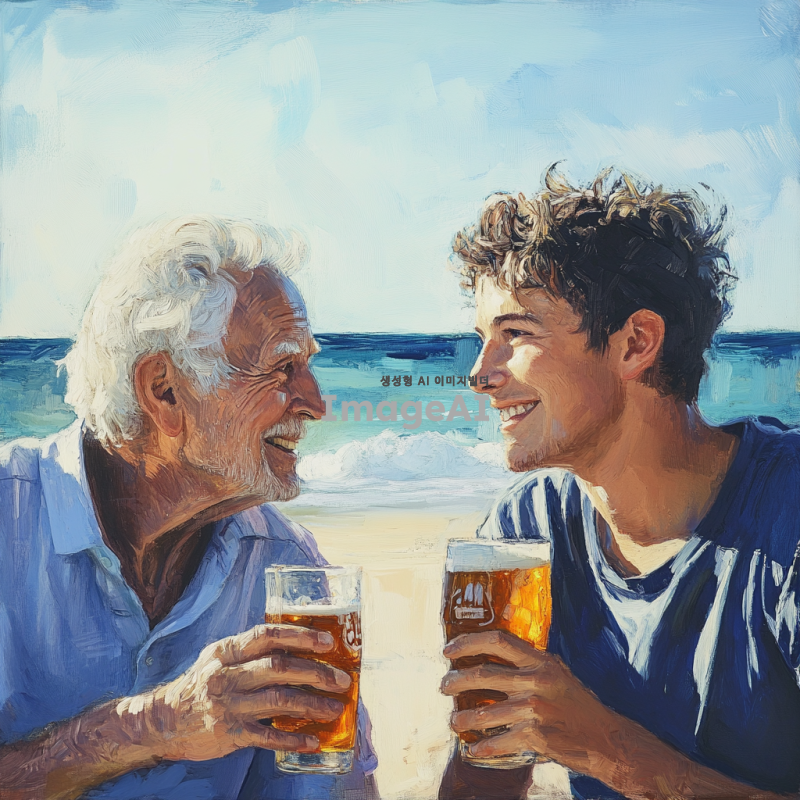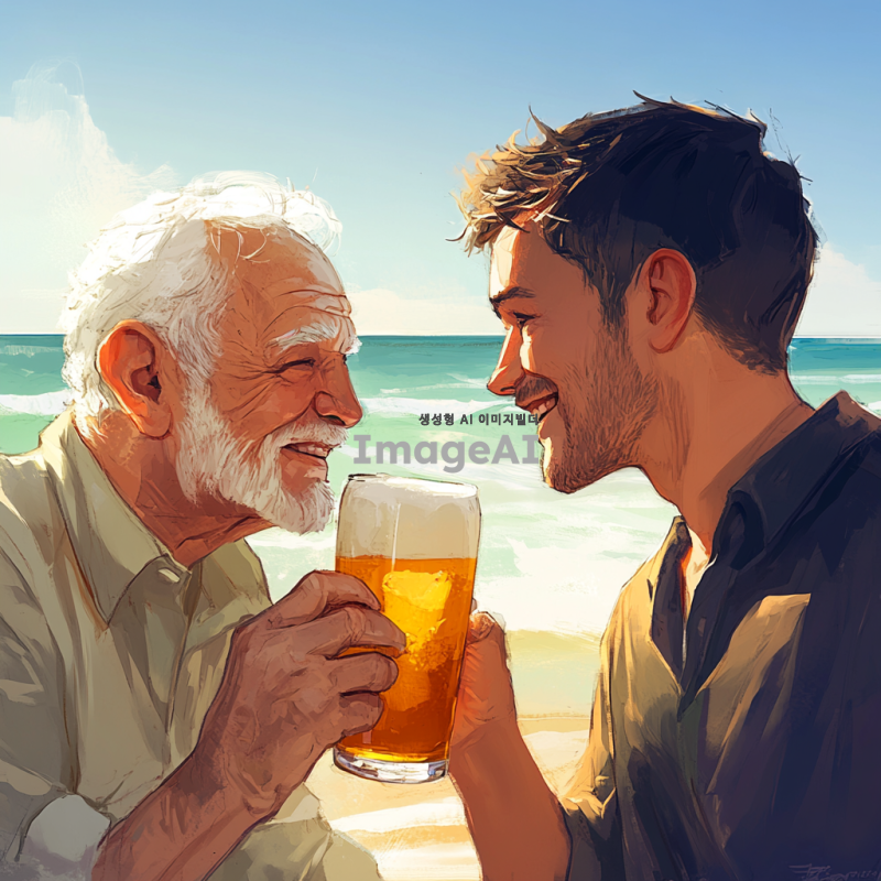 나이든 아빠와 중년의 아들이 바닷가에서 서로 마주보며 맥주를 마시는 모습을 그려줘.