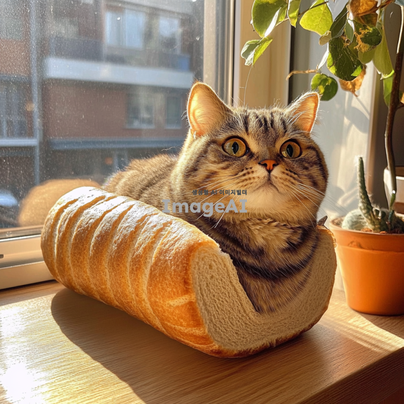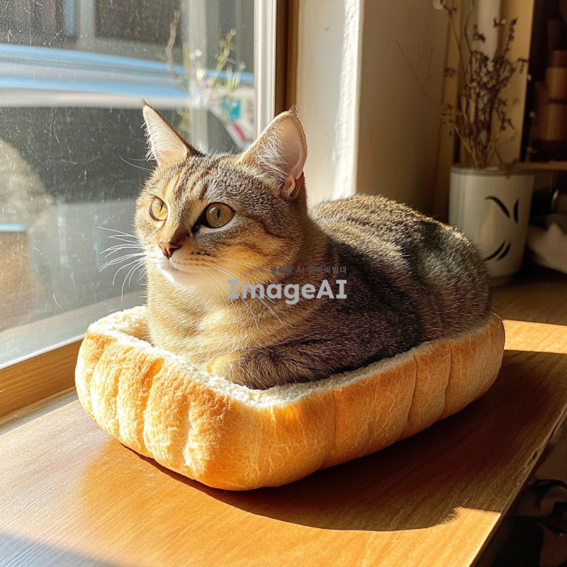 고양이가 식빵 모양으로 앉아 있는 모습, 부드러운 털과 귀여운 얼굴을 강조, 따뜻한 햇살이 비치는 창가에 앉아 있는 장면, 주변에 아늑한 분위기의 실내 인테리어, 고양이의 눈동자가 반짝이는 디테일, 자연스럽고 편안한 자세.