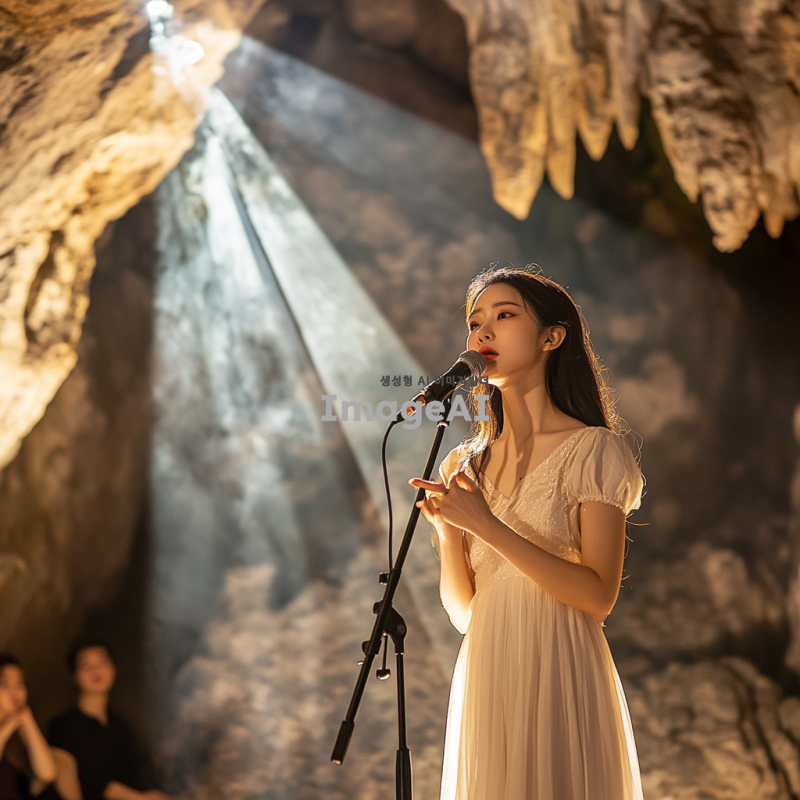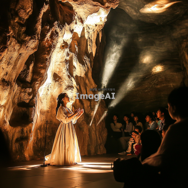 활옥동굴 내부에서 공연 중인 사람, 자연광이 동굴 벽에 부딪혀 부드럽게 퍼지는 모습, 동굴의 독특한 암석 구조와 반사되는 빛, 공연자의 열정적인 표정과 역동적인 자세, 관객들이 감상하는 모습, 신비롭고 몽환적인 분위기, 따뜻한 색조의 조명, 음악의 리듬에 맞춰 흔들리는 그림자들.
