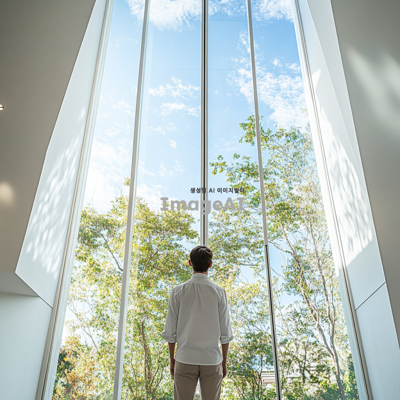 높고 넓은 창문을 통해 밖을 바라보는 남성, 흰색 바탕의 세련된 실내 인테리어, 부드러운 자연 채광, 현대적이고 깔끔한 디자인, 편안한 분위기, 남성은 캐주얼한 옷차림, 실내는 미니멀리즘 스타일, 창밖으로 보이는 푸른 하늘과 나무들.