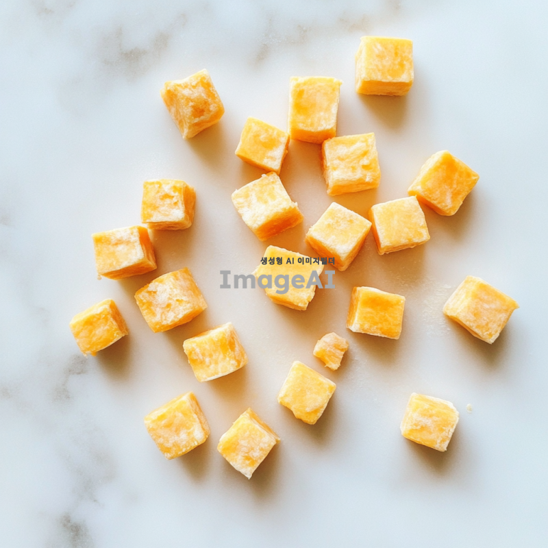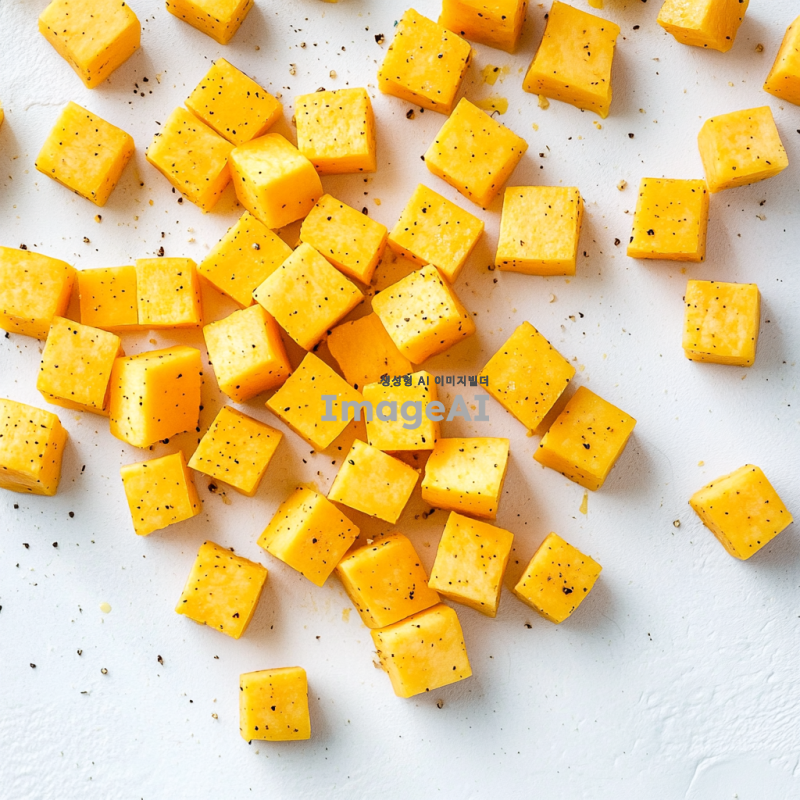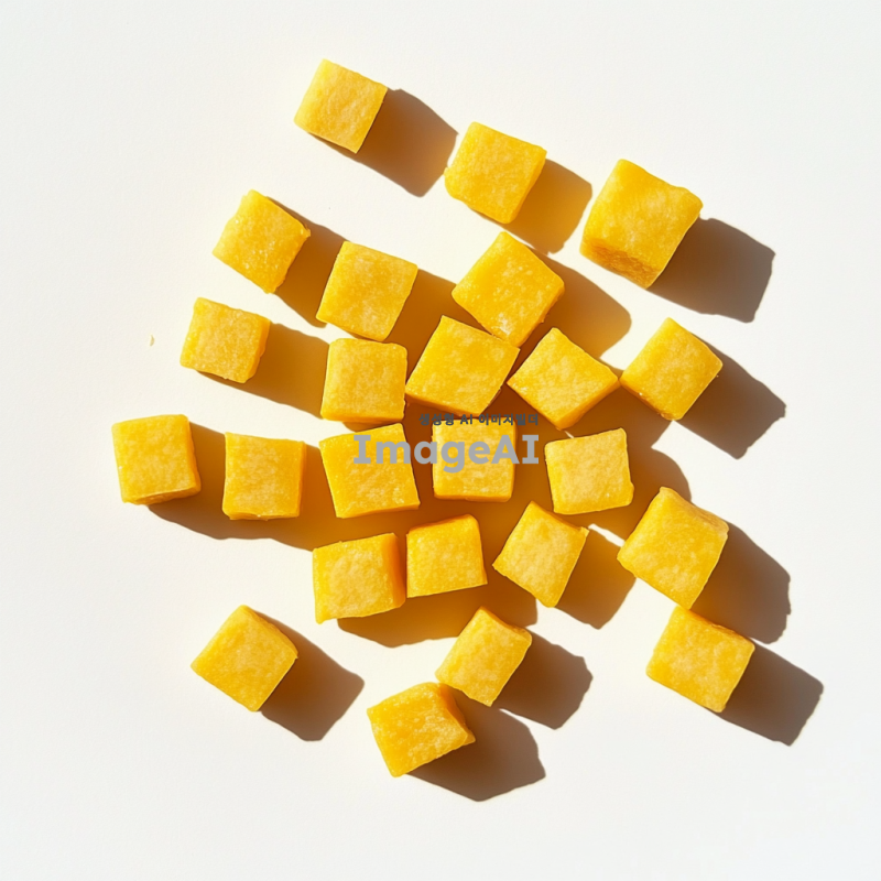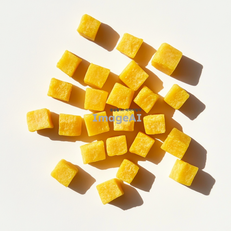 노란 고구마 다이스가 흰 배경에 놓여 있는 밝은 사진