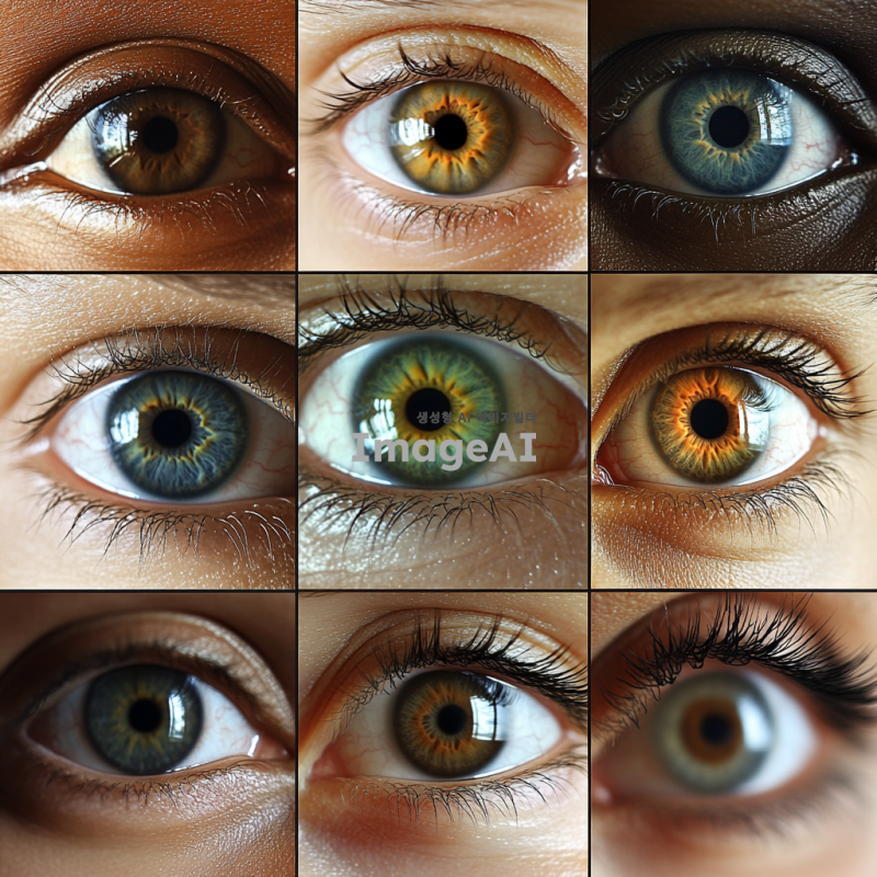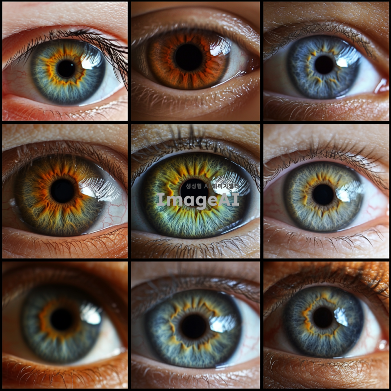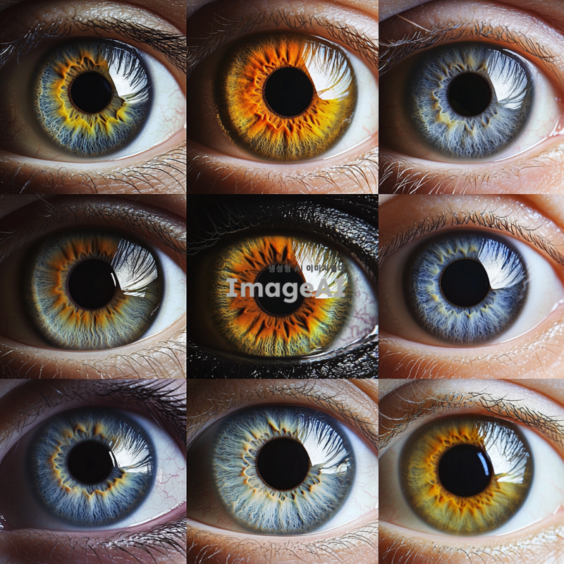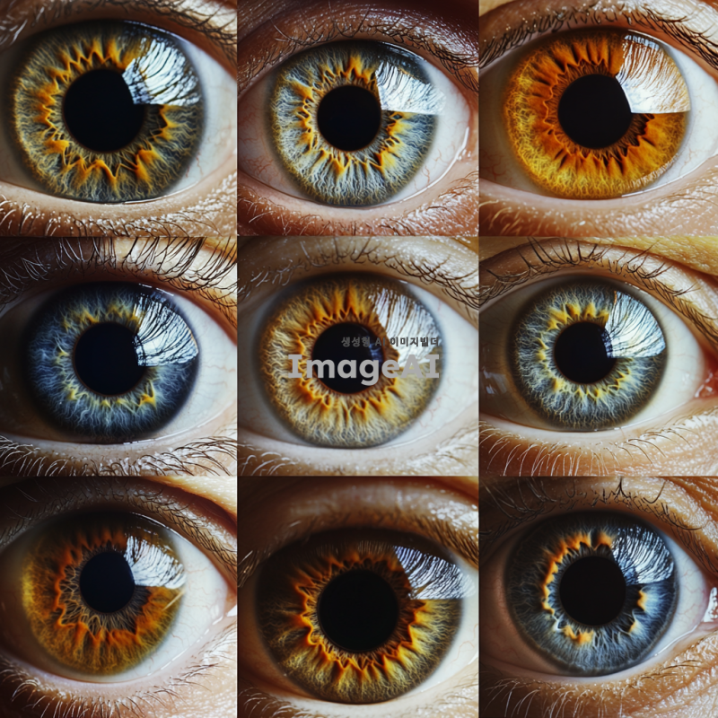 고해상도의 인간 홍채 이미지, 다양한 색상과 패턴을 가진 홍채, 눈의 디테일을 강조하여 사실적인 표현, 조명과 그림자를 활용한 깊이 있는 이미지, 홍채의 복잡한 무늬와 질감을 선명하게 표현, 자연스러운 색조와 명암 대비, 클로즈업 시점으로 촬영된 듯한 느낌, 생동감 있는 색감과 질감, 다양한 인종과 연령대의 홍채 특징 포함, 심미적으로 아름다운 구성.