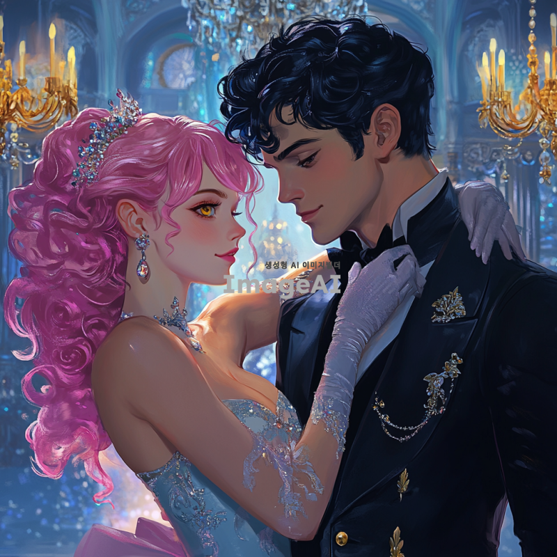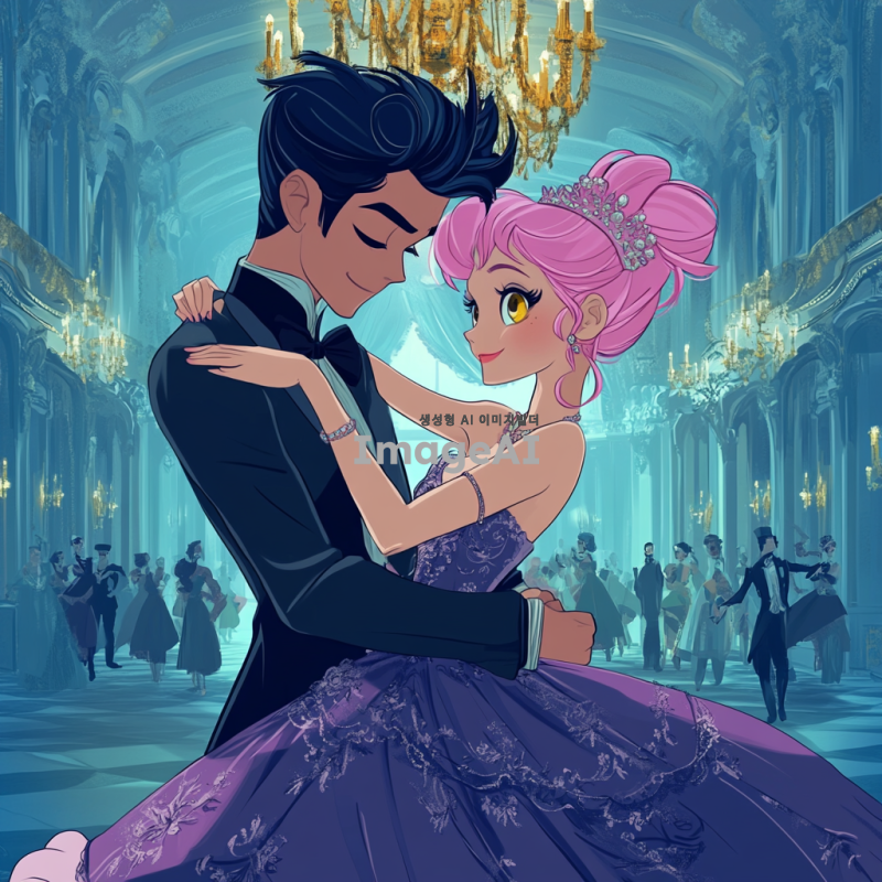 일러스트 스타일, 무도회, 화려한 드레스, 흑발 벽안의 황태자, 분홍빛 머리와 노란 눈동자의 공녀, 우아하게 춤추는 장면, 화려한 샹들리에 조명, 고풍스러운 무도회장 배경, 로맨틱하고 환상적인 분위기.