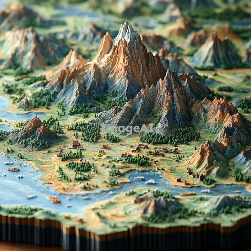 검은 배경 위에 한반도의 지형을 세밀하게 표현하고, 산맥과 강이 부드럽게 드러나도록 하며, 자연스러운 색감과 명암을 사용하여 현실감을 더한다.