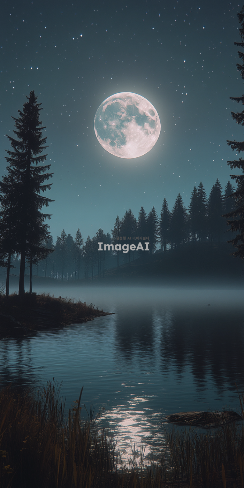 고요한 호수 위에 밝게 빛나는 보름달, 주변에는 은은한 안개가 드리워져 신비로운 분위기, 호수에 반사된 달빛이 물결에 따라 부드럽게 흔들리는 모습, 주변에는 키 큰 소나무들이 그림자처럼 서 있는 장면, 맑고 별이 가득한 밤하늘, 차분하고 평화로운 느낌.