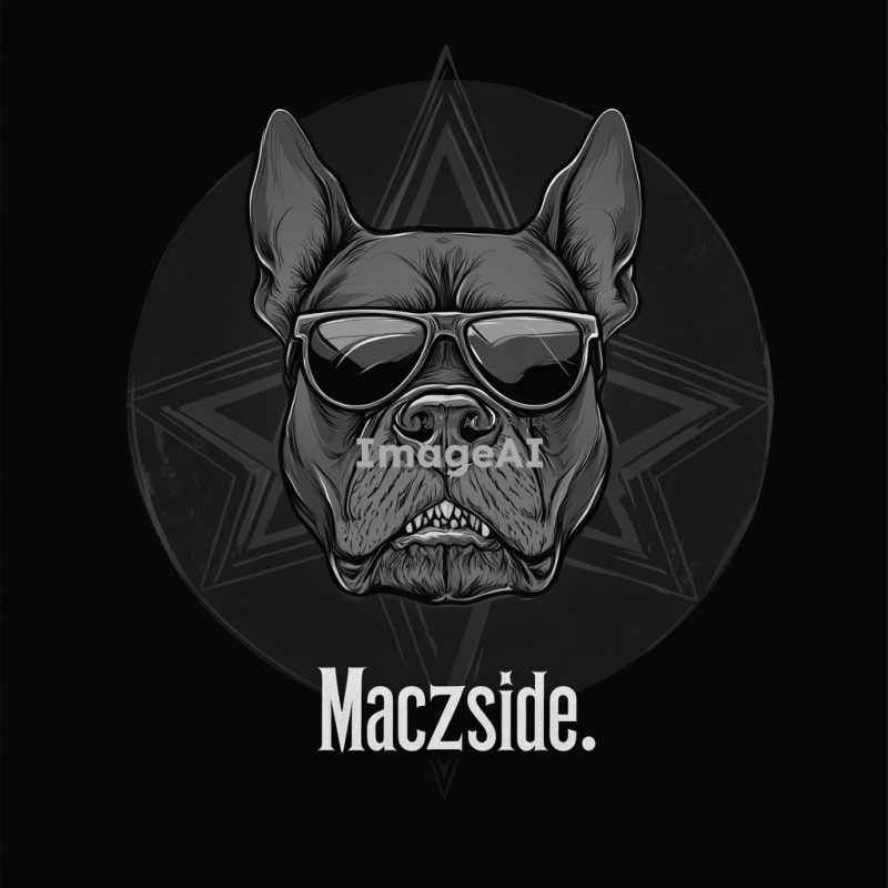 - 선글라스를 쓴 화난 핏불 해골을 특징으로 하는 로고로 배경에는 검은색 배경에 오망성이 있음. 강한 선과 날카로운 디테일을 통해 힘을 전달해야 하며, "Maczside"라는 메탈 록 밴드를 위한 디자인. 은색만 사용하며 벡터 스타일로 표현.