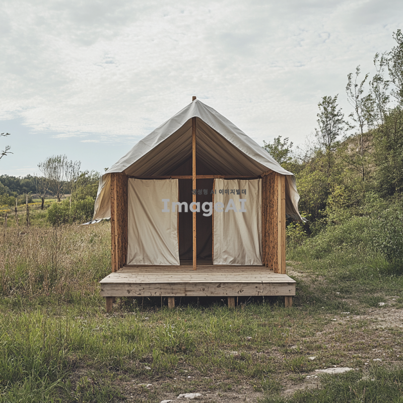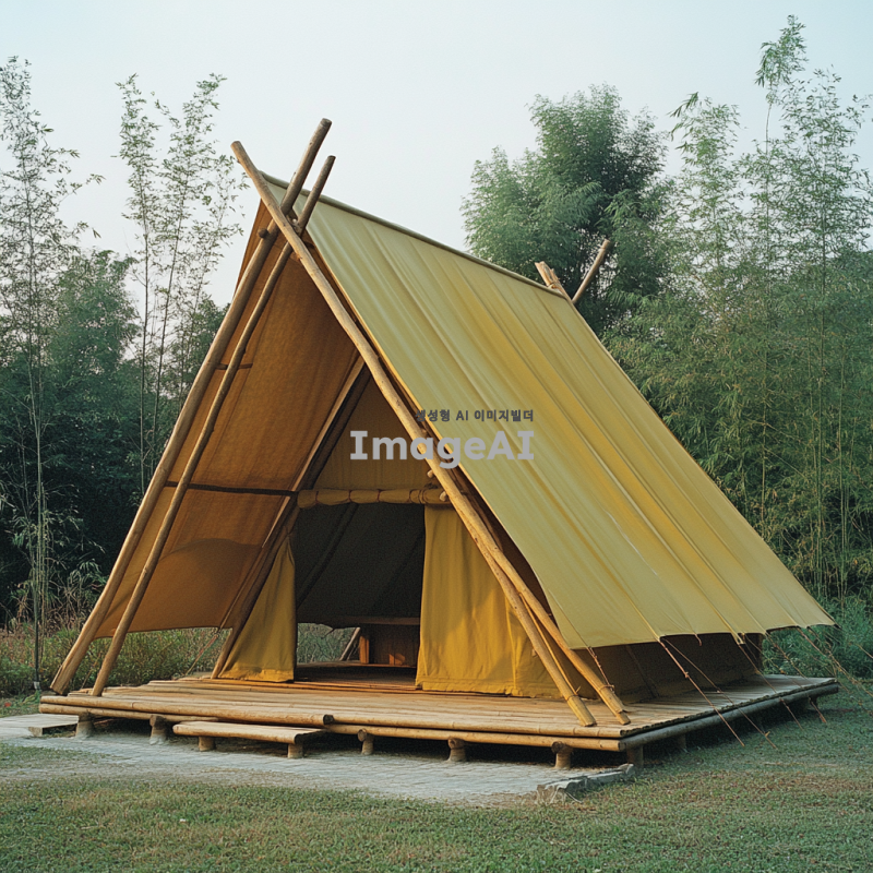 간단한 조립식 휴대용 대피소, 막사 또는 텐트 형태, 사용자가 크기 조절 가능, 비닐이나 천 재질로 비와 바람 차단, 동일한 길이의 두 개 나무로 천장 구성, 짧은 나무들로 기둥 세워 기본 구조 형성, 스태킹 방식으로 제작, 사용자가 쉽게 이해하고 구현할 수 있는 디자인, 자연 친화적인 색상과 질감, 실용적이고 효율적인 구조.