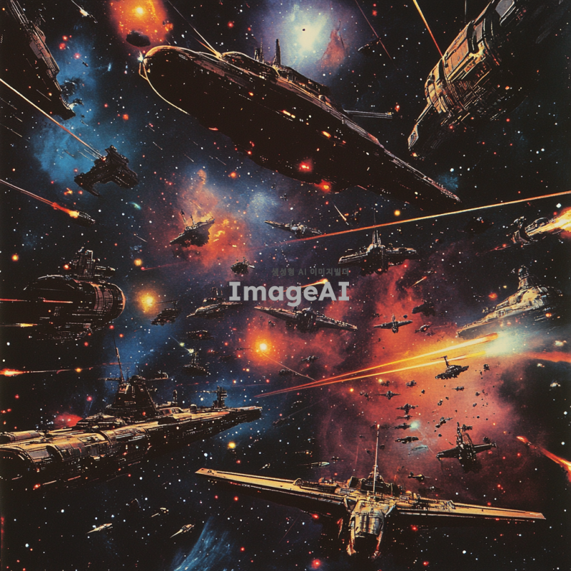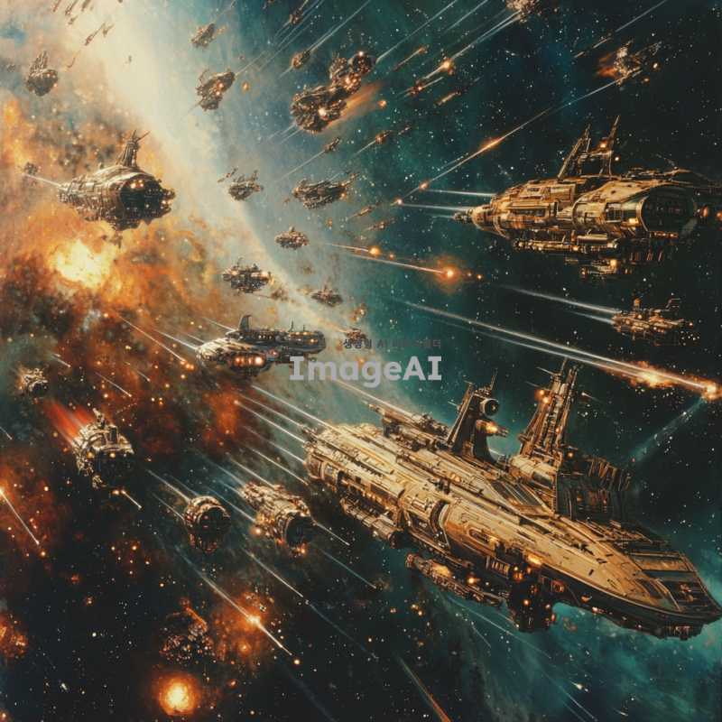 광활한 우주를 배경으로, 첨단 기술로 무장한 우주 함대들이 서로 대치하고 있는 장면. 각 함대는 독특한 디자인과 색상을 가지고 있으며, 강력한 레이저와 에너지 무기가 장착되어 있다. 배경에는 먼 은하와 성운이 펼쳐져 있으며, 함대 사이에는 긴장감이 감도는 전투의 순간이 포착되어 있다. 우주선의 표면에는 반짝이는 금속과 복잡한 기계 구조가 드러나며, 주변에는 작은 전투기들이 빠르게 날아다니고 있다. 전투의 긴박함과 미래적인 분위기를 강조하는 이미지.