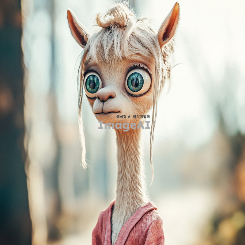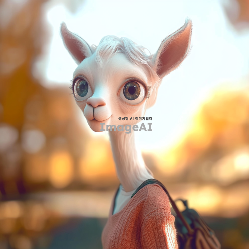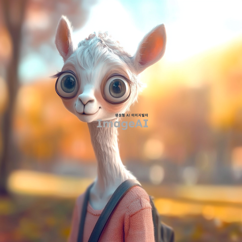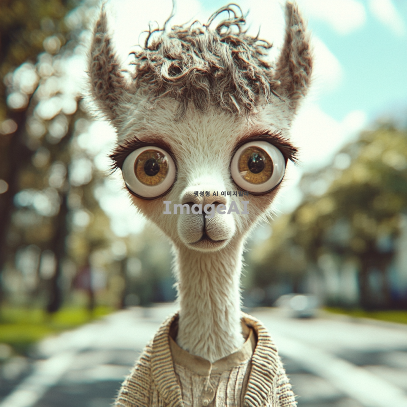 흰색 라마의 얼굴을 가진 캐릭터, 사람의 몸을 하고 있으며 부드러운 털과 큰 눈을 갖고 있음. 캐릭터는 캐주얼한 옷차림을 하고 있으며, 밝고 친근한 표정을 짓고 있음. 배경은 자연 속에서 평화로운 분위기를 연출하고 있으며, 햇빛이 따뜻하게 비치는 모습.