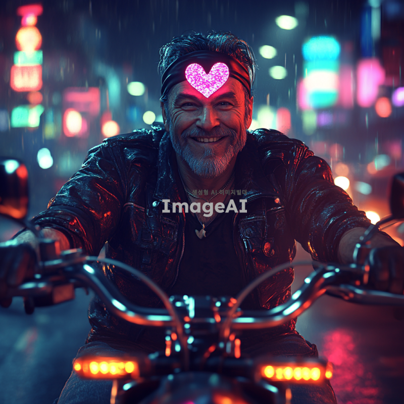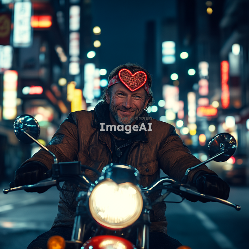 술에 취한 중년 남성이 하트 모양의 머리띠를 하고 오토바이를 타고 있는 장면, 밤하늘 아래 도시의 거리 배경, 오토바이의 불빛이 반짝이는 모습, 남성의 얼굴은 웃고 있으며 약간 붉어진 볼을 가진 모습, 주변에는 흐릿한 도시의 불빛과 네온사인이 함께 어우러진 분위기.
