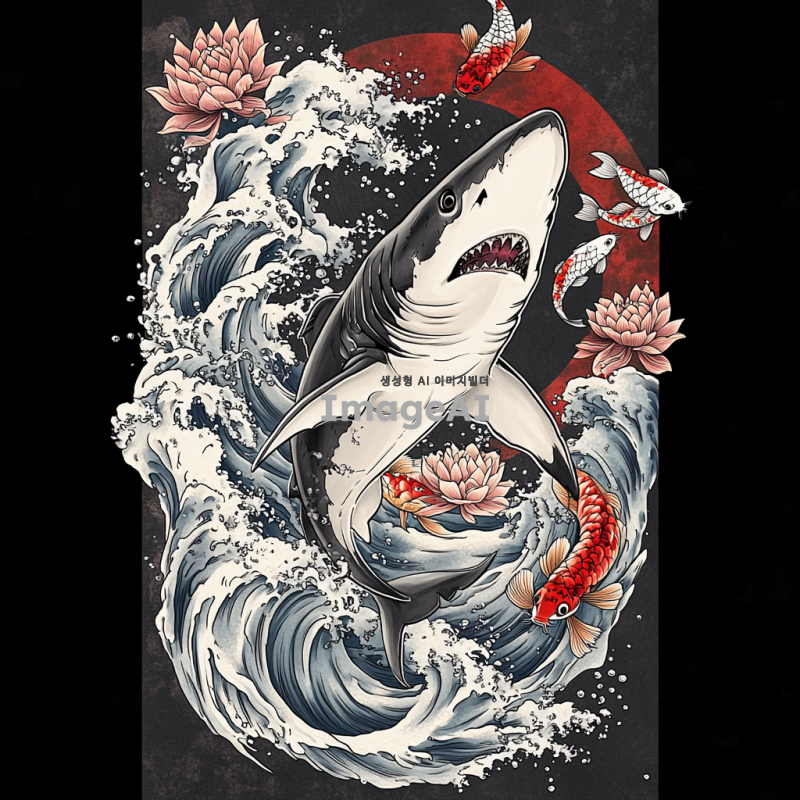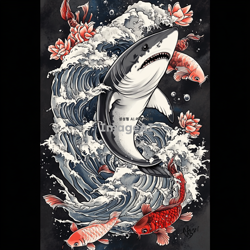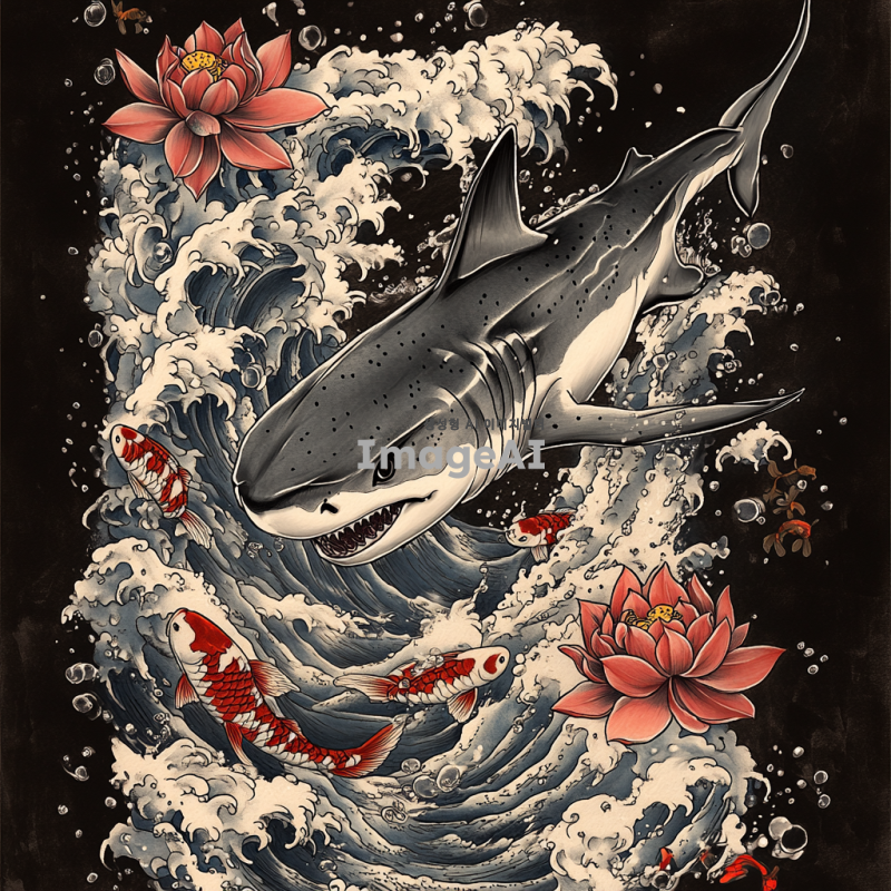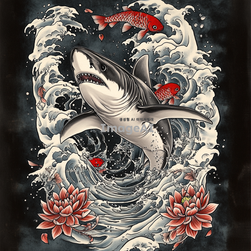 전통적인 일본 이레즈미 스타일로 그려진 상어 문신, 물결과 함께 역동적으로 움직이는 상어, 세밀한 비늘과 강렬한 눈빛, 주변에 잉어와 연꽃이 조화를 이루며, 깊은 바다의 느낌을 주는 어두운 배경, 강렬한 색채와 대비를 통해 생동감을 강조한 디자인.
