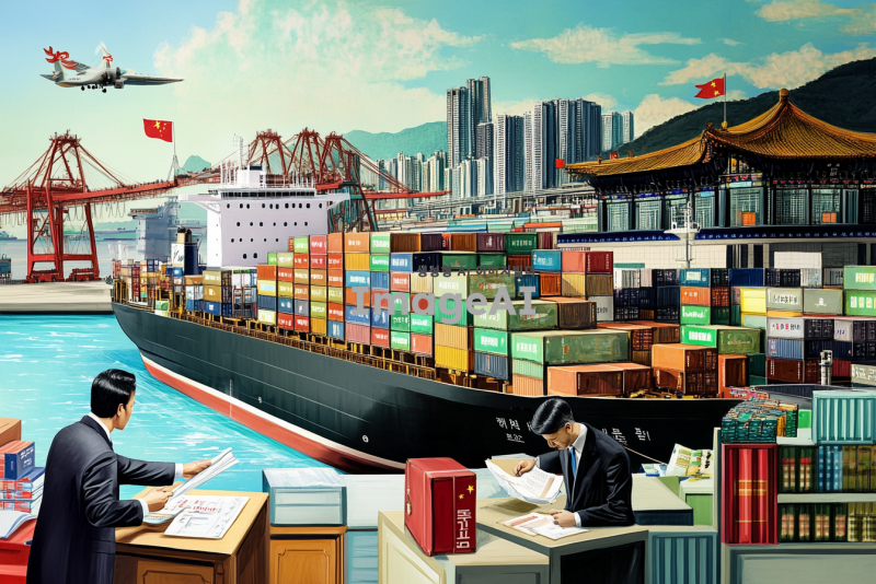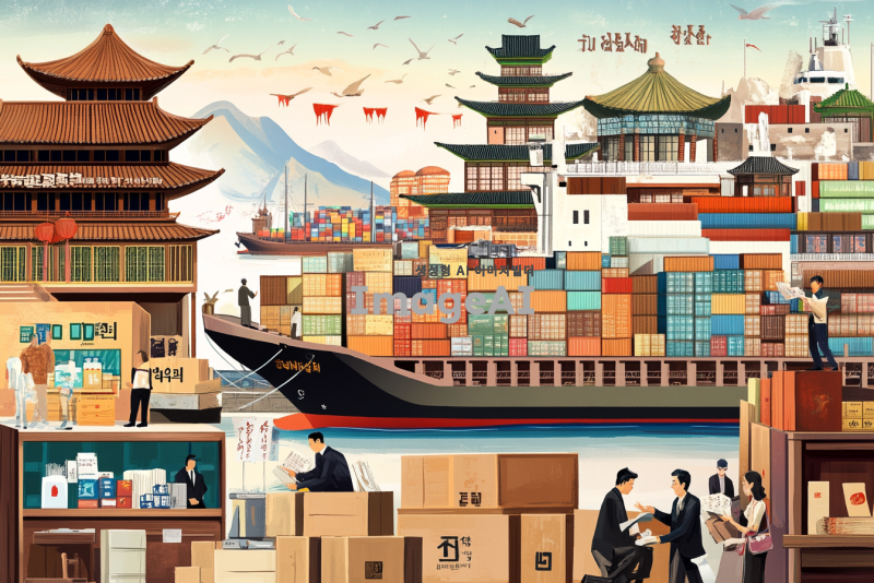 중국과 한국 간의 무역을 상징하는 이미지, 다양한 상품들이 컨테이너에 실려 항구에 정박한 대형 화물선, 중국과 한국의 전통적인 건축물이 배경에 조화롭게 어우러진 장면, 현대적인 무역의 활발함을 나타내는 비즈니스맨들이 서류를 검토하고 있는 모습, 전자기기, 패션, 생활용품 등 다양한 제품들이 선반에 진열된 모습, 글로벌 시장을 배경으로 한 중국과 한국의 협력적인 무역 관계를 시각적으로 표현하는 이미지.