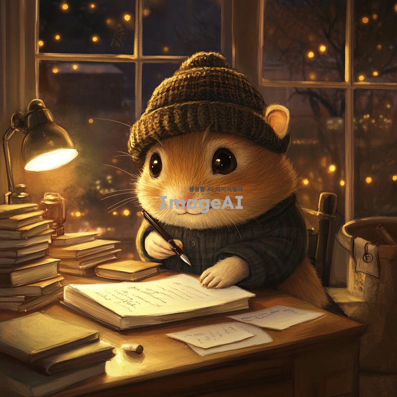 작가의 모자를 쓴 귀여운 햄스터, 작은 책상에 앉아 펜을 들고 글을 쓰고 있는 모습, 주변에는 책과 종이가 가득 쌓여 있으며, 따뜻한 조명이 비추는 아늑한 방, 햄스터의 눈은 반짝이며 창의적인 아이디어가 넘치는 표정, 부드럽고 따뜻한 색감의 일러스트 스타일