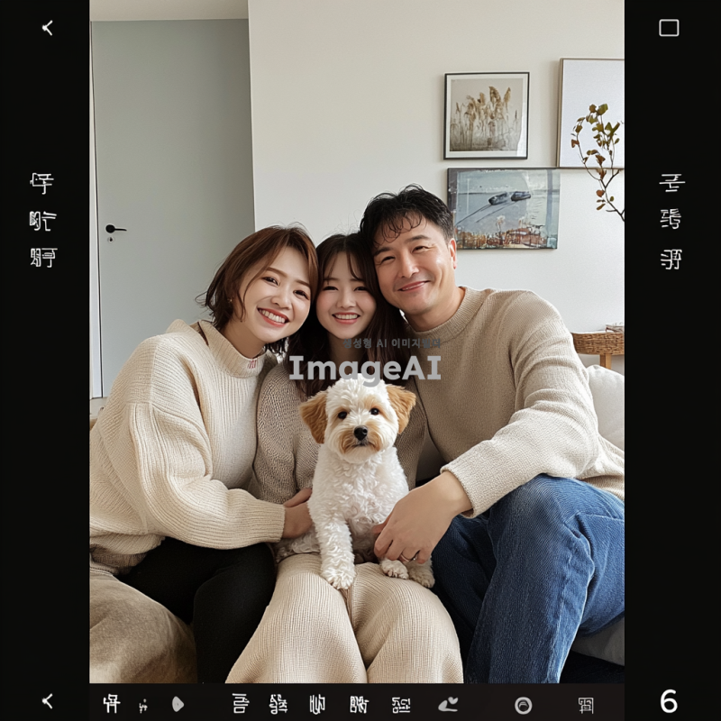 따뜻한 가족사진, 밝은 분위기, 실내 배경, 말티푸 강아지와 함께 있는 모습, 엄마 154cm, 아빠 175cm, 나 155cm, 엄마 6등신, 아빠 7등신, 나 6등신, 캐주얼한 옷차림, 웃고 있는 얼굴, 자연스러운 포즈, 가족애가 느껴지는 장면, 강아지는 가족 앞에 앉아있는 모습, 부드러운 조명, 아늑한 가정의 느낌.