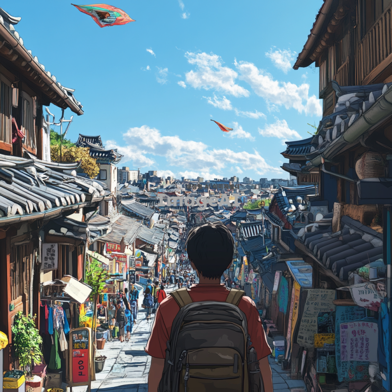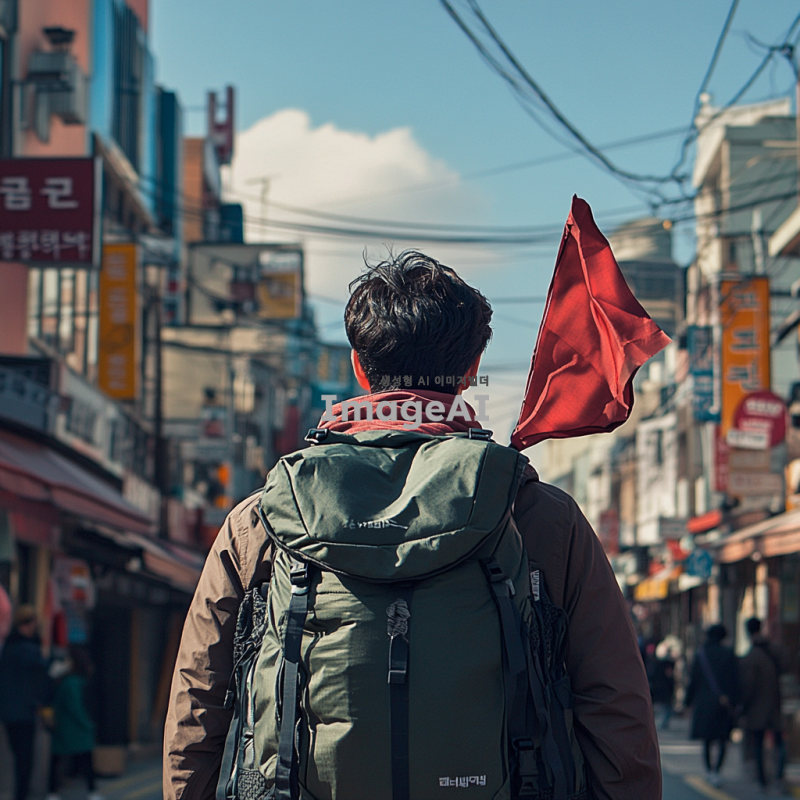 배낭을 메고 태극기가 휘날리는 장면, 푸른 하늘 아래 다양한 문화가 어우러진 도시 풍경, 여행자의 뒷모습이 태극기와 함께 조화를 이루는 모습, 자유롭고 활기찬 분위기, 다양한 사람들이 어우러진 거리, 여행자의 발걸음이 닿는 곳마다 새로운 경험이 가득한 느낌, 태극기가 바람에 휘날리며 여행의 열정을 상징하는 이미지.