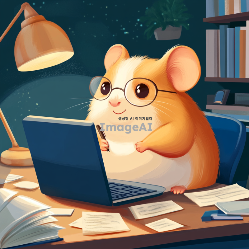 지적여 보이는 햄스터 캐릭터가 기대 앉아 노트북을 활용해 글을 쓰고 있는 이미지.