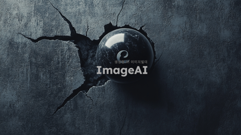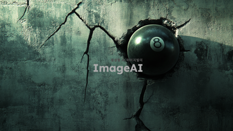 벽에 박힌 8번 당구공, 벽에 생긴 균열, 사실적인 디테일, 어두운 조명, 콘크리트 질감, 공의 음영과 반사, 균열의 깊이와 형태, 정적인 분위기.