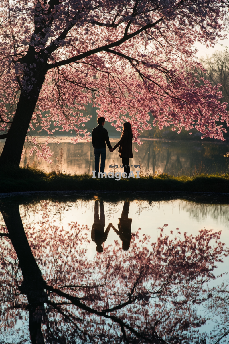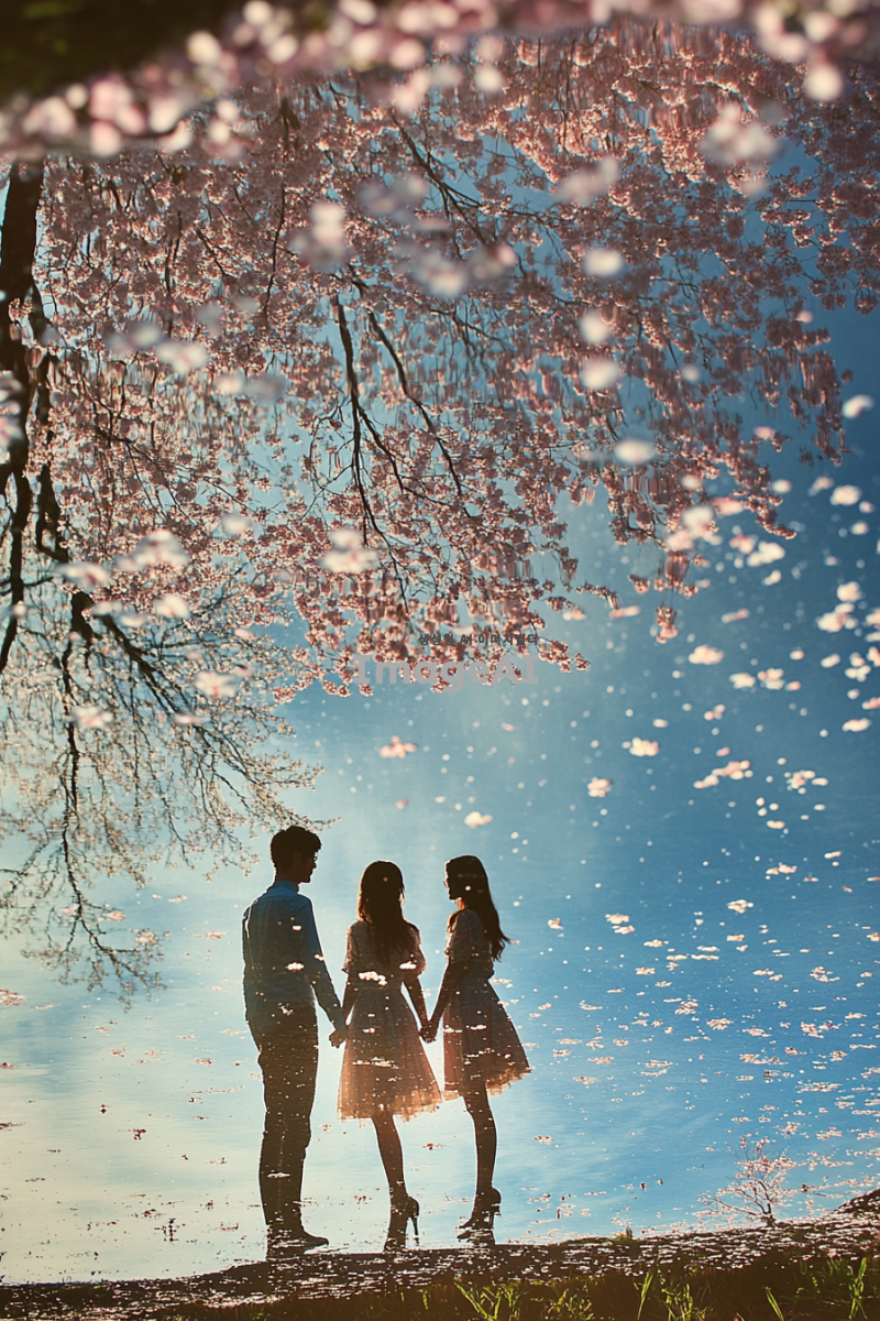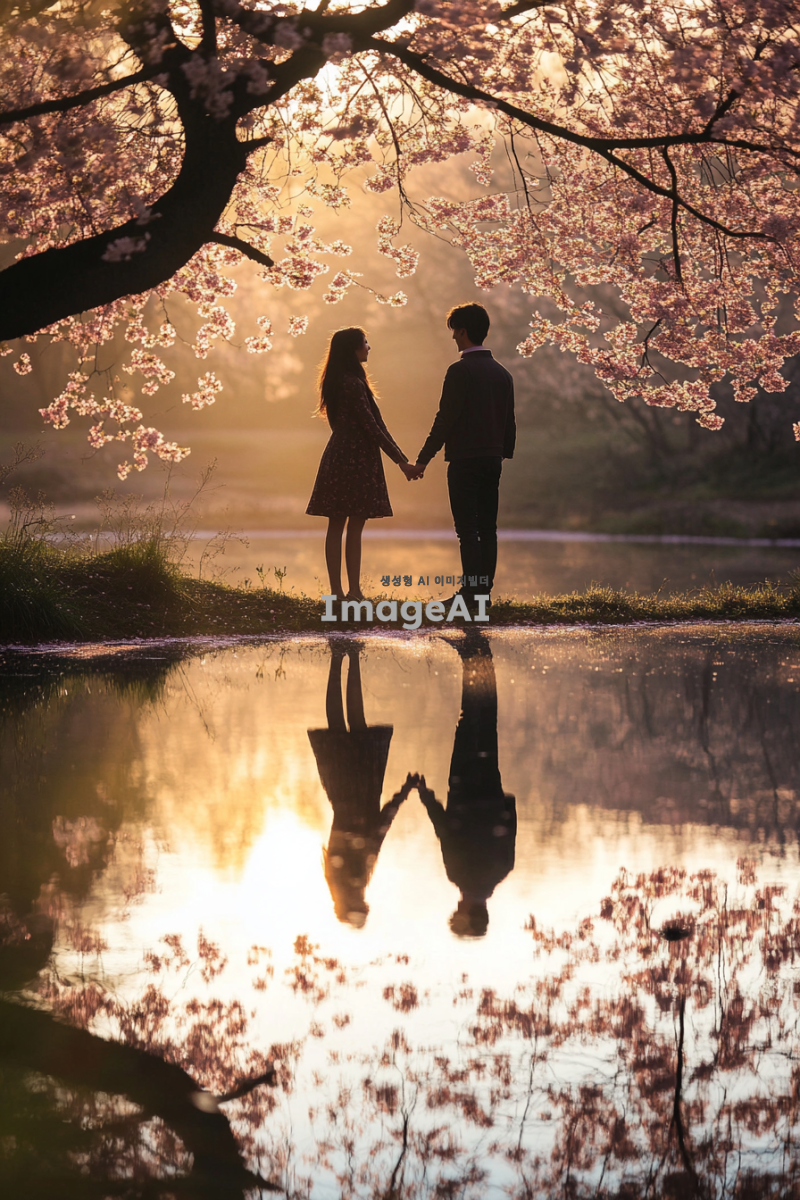 벚꽃나무 아래에서 손을 잡고 있는 남녀, 잔잔한 연못에 비치는 어린 남녀의 모습, 부드러운 봄날의 분위기, 따뜻한 햇살과 벚꽃잎이 흩날리는 장면, 로맨틱하고 평화로운 느낌, 자연과 어우러진 사랑스러운 순간.