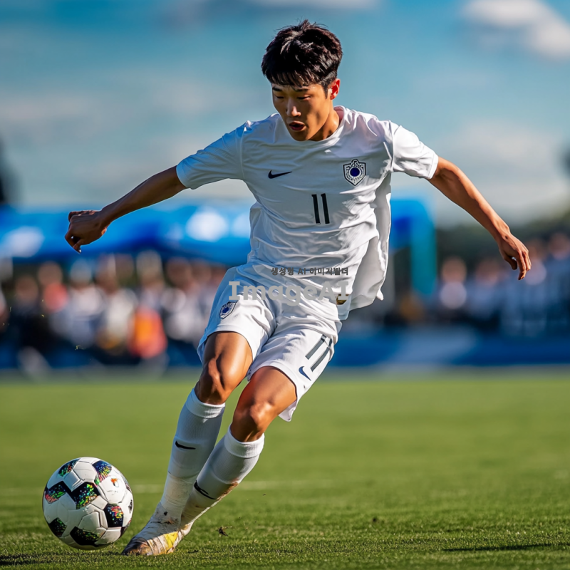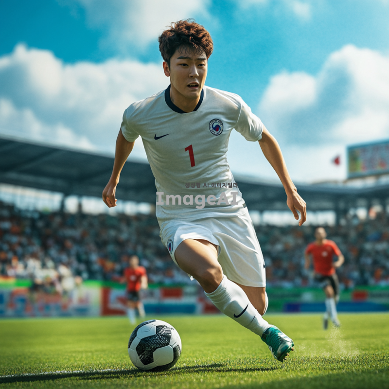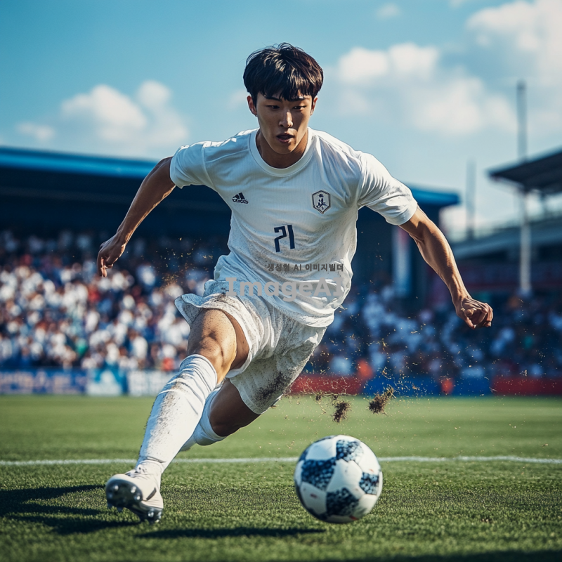 20대 한국인 남성 축구선수가 경기장에서 역동적으로 공을 차는 순간, 푸른 잔디 위에서 땀에 젖은 흰 유니폼을 입고 있으며, 배경에는 환호하는 관중과 푸른 하늘이 펼쳐져 있는 장면, 선수의 얼굴은 강한 집중력과 열정이 담겨 있는 모습, 축구화는 최신형 디자인으로 빛나고 있음.