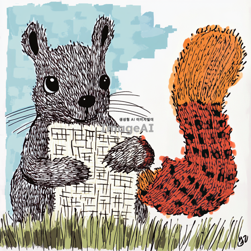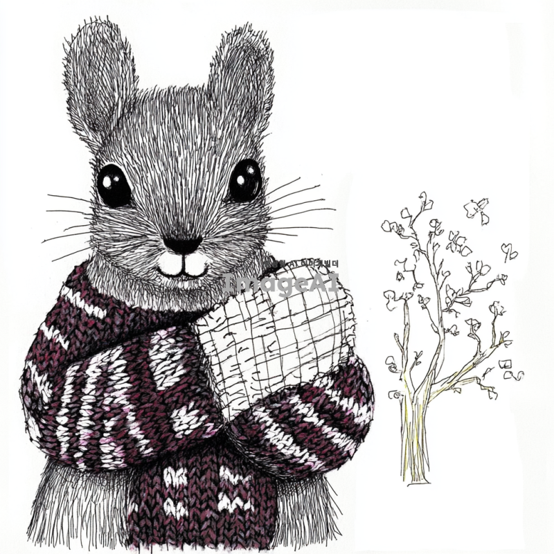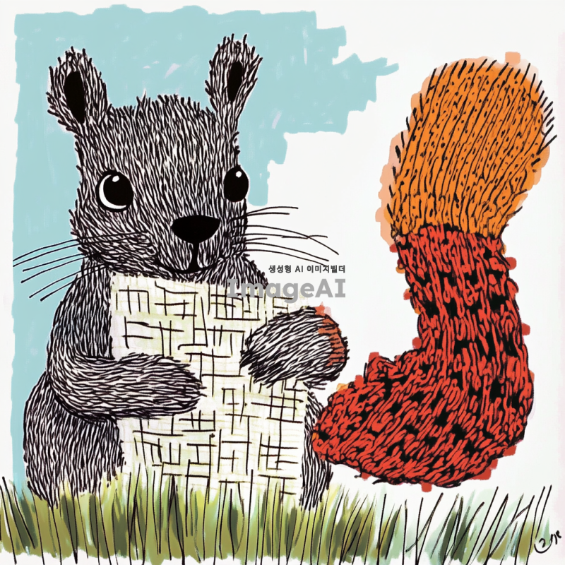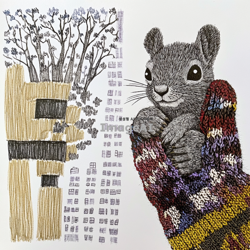 참조 자료와 같은 그림체로 뜨개질 장갑의 재질로 다람쥐를 그려줘