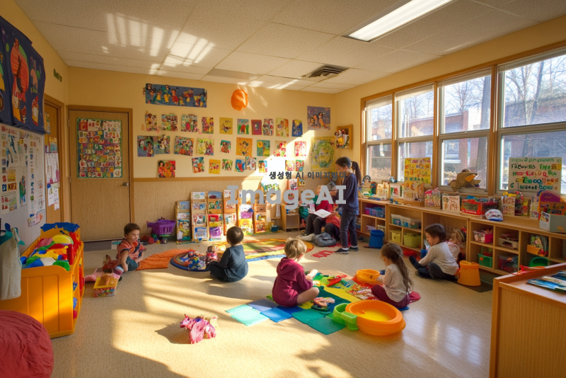 밝고 화사한 유치원 교실, 다양한 인종의 아이들이 함께 놀이를 즐기고 있는 모습, 벽에는 알록달록한 그림과 알파벳 포스터가 걸려 있고, 바닥에는 부드러운 매트와 장난감들이 놓여 있는 장면, 선생님이 아이들과 함께 웃으며 책을 읽고 있는 따뜻한 분위기, 창문으로 햇살이 부드럽게 들어오는 모습, 전체적으로 아늑하고 안전한 느낌.