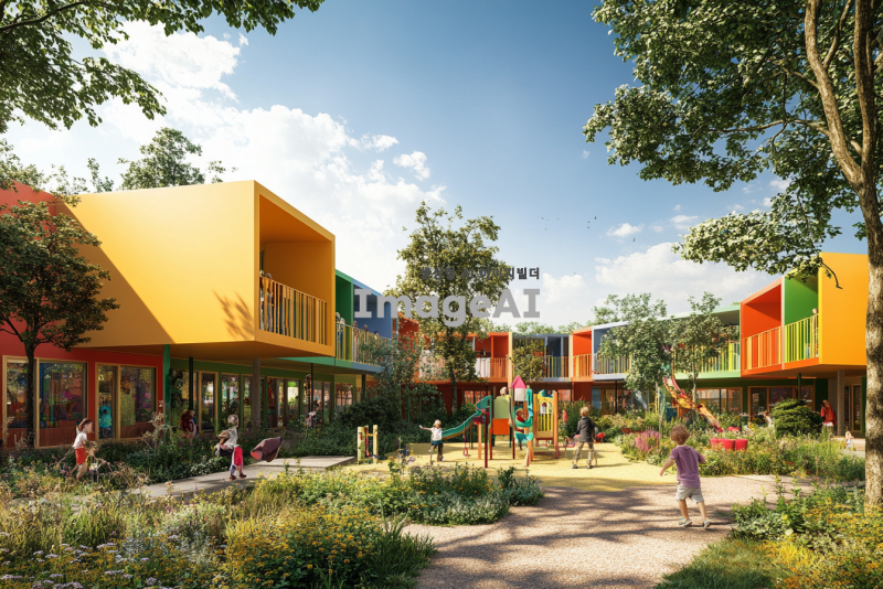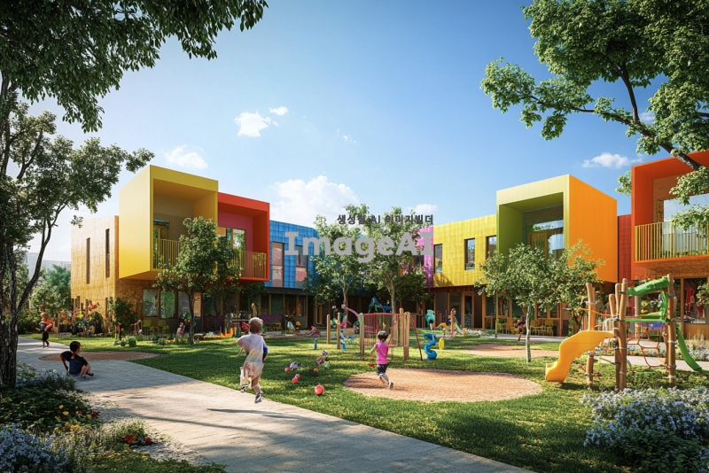 밝고 친근한 유치원 외부, 알록달록한 색상의 건물, 놀이기구와 어린이들이 뛰어노는 정원, 푸른 하늘과 햇살이 비치는 풍경, 안전하고 환영하는 분위기, 다양한 나무와 꽃들이 어우러진 정원, 미소 짓는 어린이들, 창의적인 디자인의 건축물, 자연과 조화를 이루는 환경.