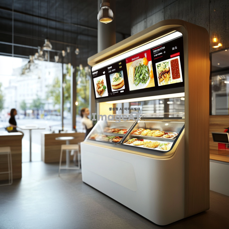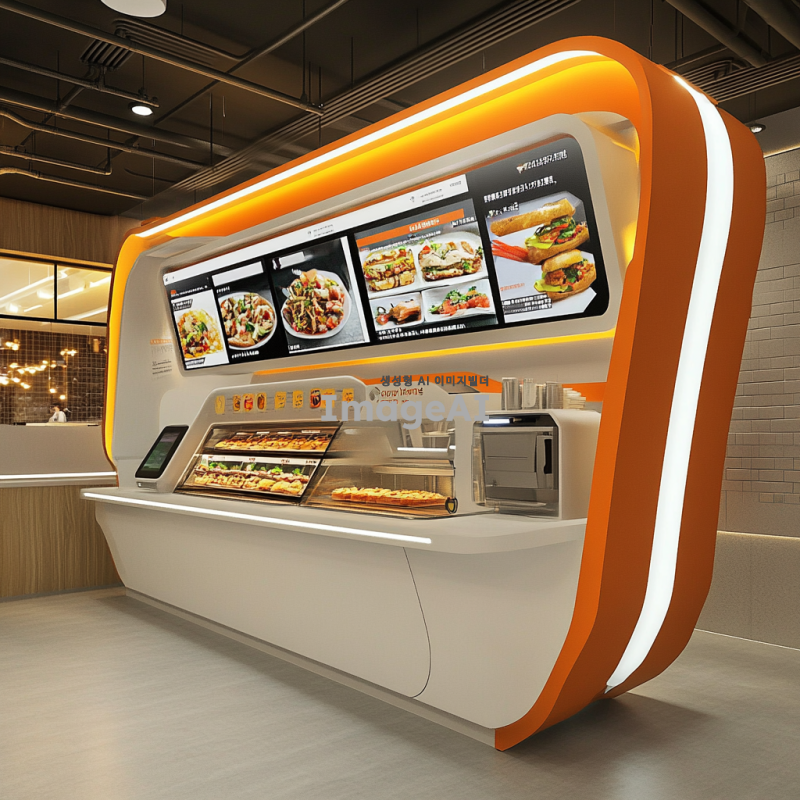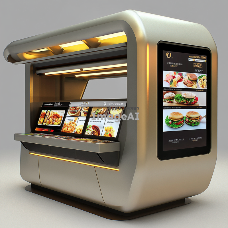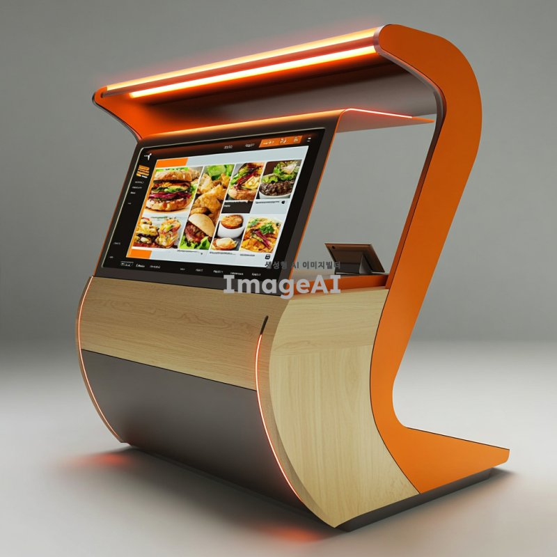 현대적이고 깔끔한 디자인의 패스트푸드 키오스크, 사용자 친화적인 인터페이스, 터치스크린 디스플레이, 다양한 메뉴 옵션이 선명하게 보이는 화면, 밝고 환영하는 분위기의 조명, 효율적인 공간 활용, 고객이 쉽게 접근할 수 있는 위치, 브랜드 로고와 색상이 잘 어우러진 디자인, 대기시간을 줄이기 위한 직관적인 내비게이션, 환경 친화적인 소재 사용.