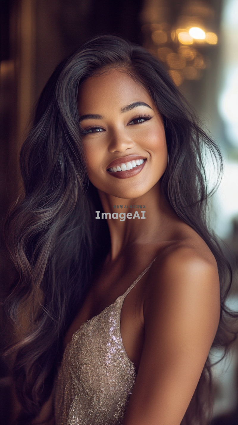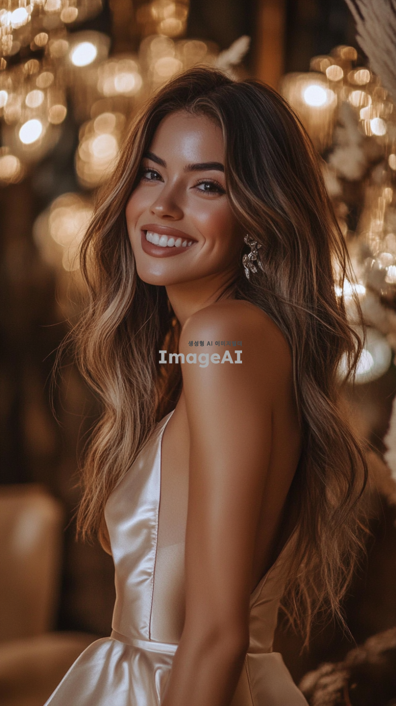 매혹적이고 우아한 분위기의 여성, 부드러운 조명 아래에서 긴 웨이브 머리, 세련된 드레스 착용, 미소를 짓고 있는 모습, 고급스러운 배경, 여성스러운 포즈, 자연스러운 메이크업, 화려한 액세서리로 포인트를 준 스타일.