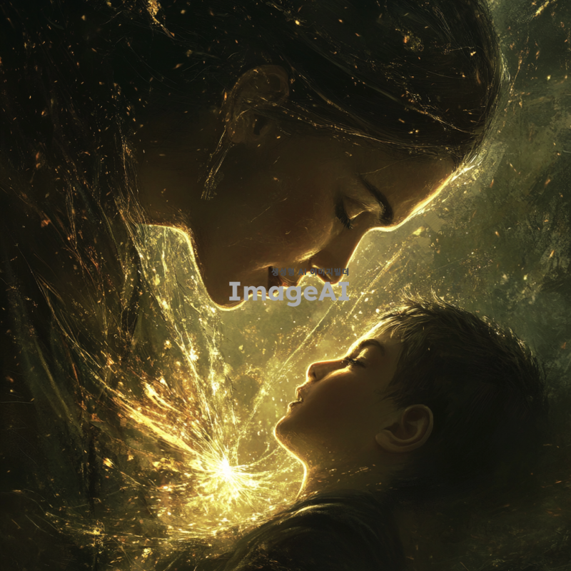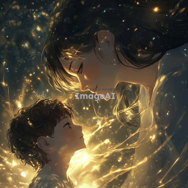 따뜻하고 부드러운 빛으로 둘러싸인 하늘 위에서 어머니가 아들을 지켜보는 장면. 어머니의 얼굴에는 깊은 사랑과 안타까움이 담겨 있으며, 그녀의 눈에는 아들을 향한 희망이 반짝입니다. 아들은 땅 위에서 고개를 숙이고 있지만, 그의 주위에는 어머니의 사랑이 은은한 빛으로 감싸고 있어 위로받고 있는 듯한 느낌을 줍니다. 하늘과 땅 사이에는 희미한 연결고리가 있어, 둘 사이의 끊어지지 않는 깊은 유대감을 상징합니다. 전체적인 분위기는 감동적이고 따뜻하며, 어머니의 사랑이 아들에게 닿아 그의 마음속에 작은 희망의 불씨를 지피고 있는 장면을 표현합니다.
