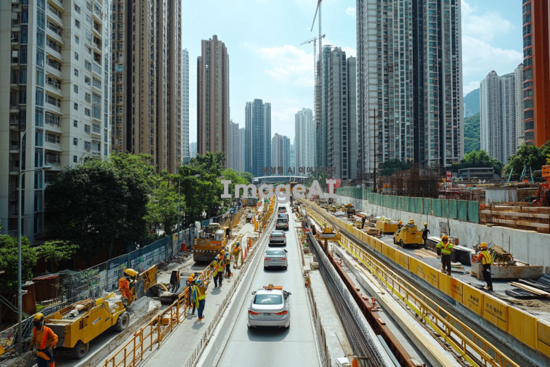 도심 속 고층건물 앞 도로에 고급 자동차들이 줄지어 지나가고 있으며, 도로 옆에는 지하철 공사현장에서 일하는 공사 관계자들이 안전모를 쓰고 작업하는 모습. 현대적이고 세련된 도시 풍경, 바쁜 일상 속에서의 조화로운 장면.