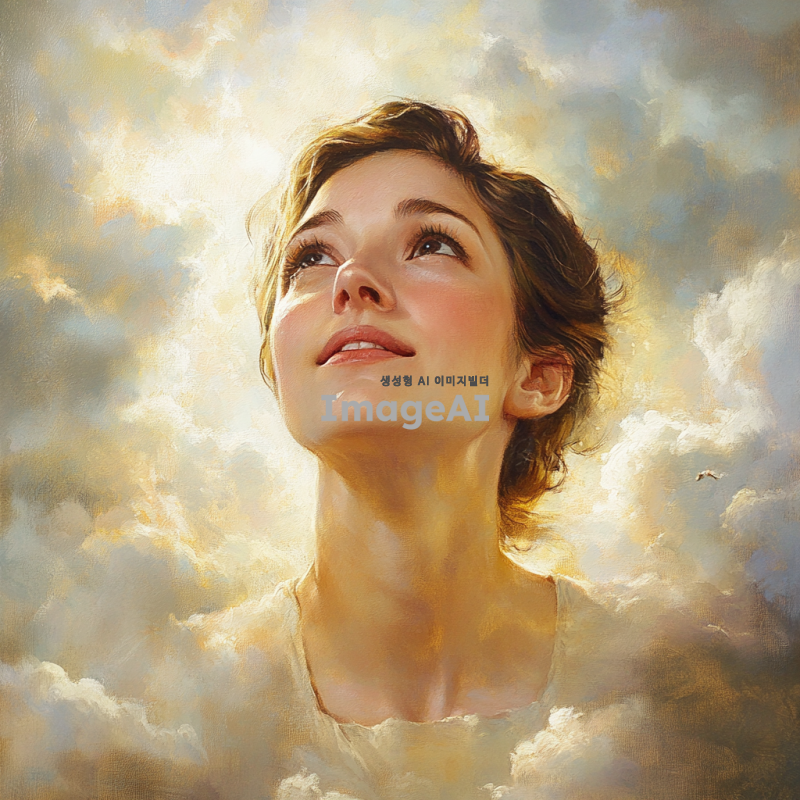 어머니의 따뜻하고 깊은 사랑이 담긴 모습, 하늘에서 아들을 지켜보며 희망을 전하고자 하는 모습. 어머니의 얼굴에는 슬픔과 안타까움이 깃들어 있으면서도 강한 위로와 희망을 주고자 하는 결의가 보인다. 그녀의 주변에는 부드럽고 따스한 빛이 감싸고 있으며, 하늘과 연결된 듯한 느낌을 주는 구름이 어머니의 뒤에 펼쳐져 있다. 다니엘에게 보내는 메시지를 담은 듯한, 부드러운 미소와 눈빛 속에서 끊어지지 않는 깊은 연결이 느껴진다. 이 이미지에는 절망 속에서도 희망을 잃지 말라는 어머니의 간절한 마음이 담겨 있다.