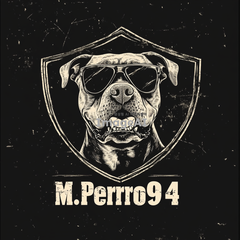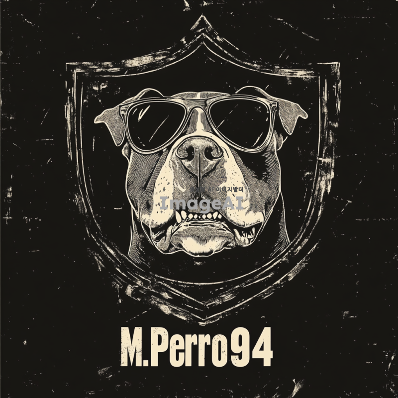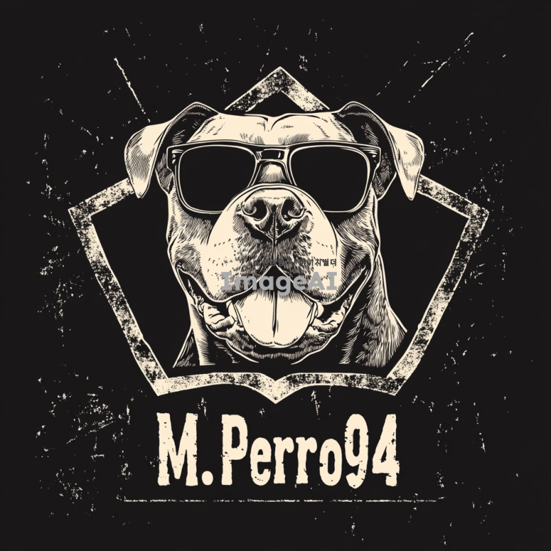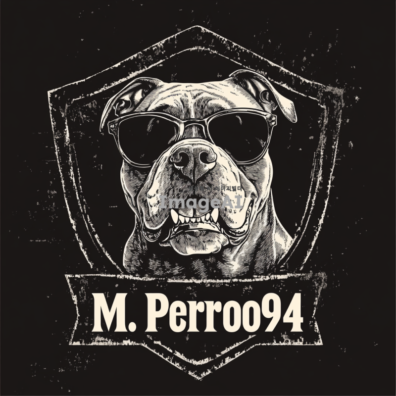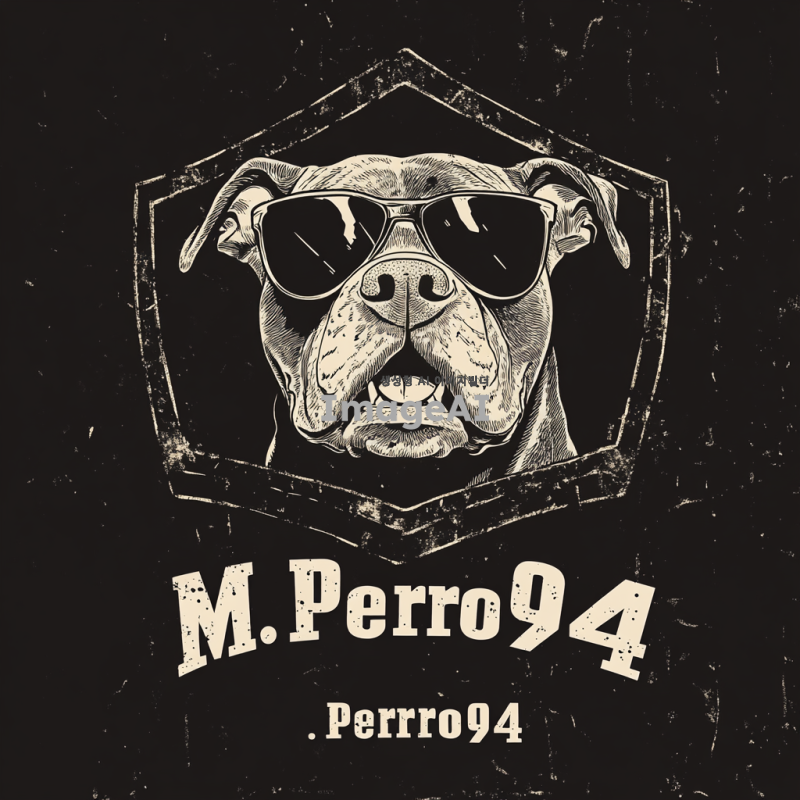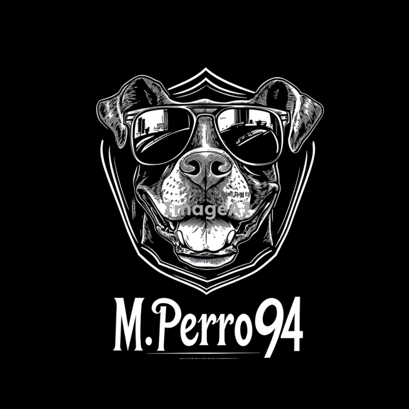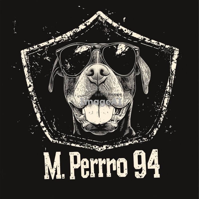 로고는 그런지 스타일로, "M.Perro94"라는 텍스트와 함께 입 다물고 이빨이 튀어나와 있는 핏불이 선글라스를 쓰고 LAPD배지 모양 안에 있는 디자인입니다. 단색 배경에 티셔츠 프린트용 로고 디자인으로, 벡터 아트, 간단한 선 아트, 검은색 배경에 흰색 글씨가 위에 있는 2D 벡터 그래픽입니다.