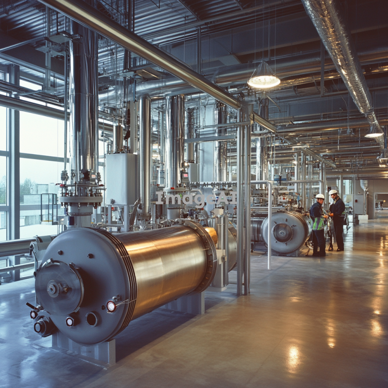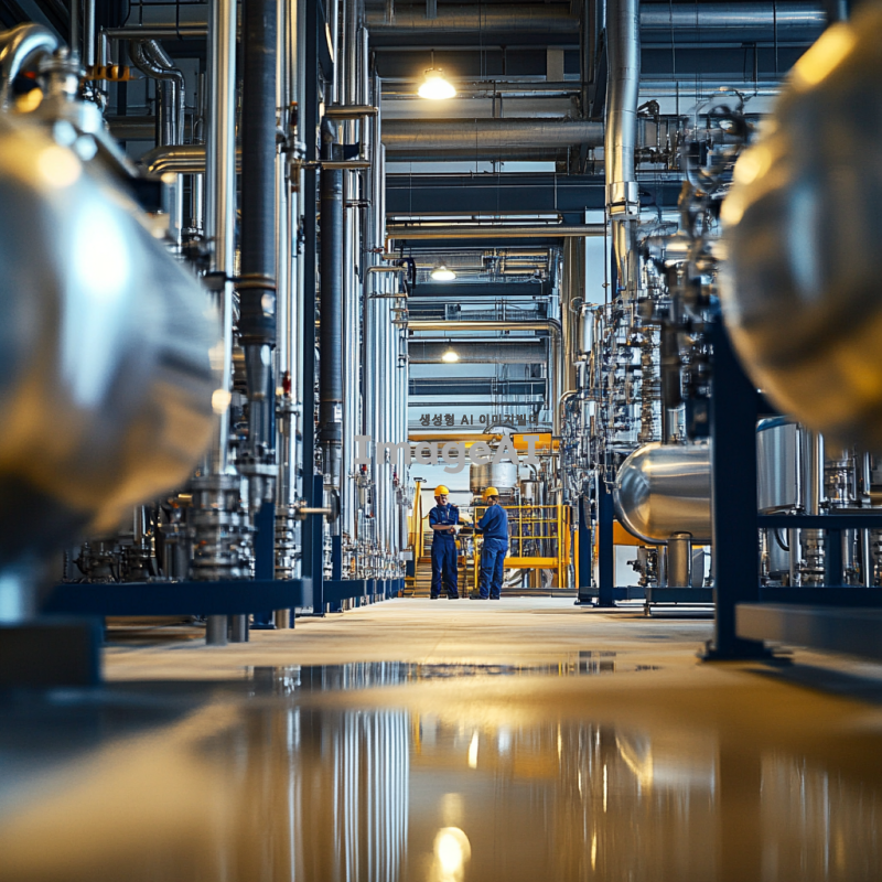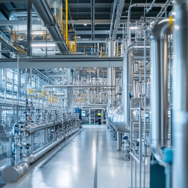 산업용 공장 내부에 여러 개의 수전해 장치가 정렬되어 있는 모습, 현대적인 기계와 배관들이 복잡하게 얽혀 있으며, 깨끗하고 정돈된 환경, 금속과 유리 소재의 장치들이 빛을 반사하며 반짝임, 작업 중인 폴란드 기술자들이 안전 장비를 착용하고 있는 장면, 공장의 조명은 밝고 효율적인 느낌, 기술과 혁신의 분위기 강조.