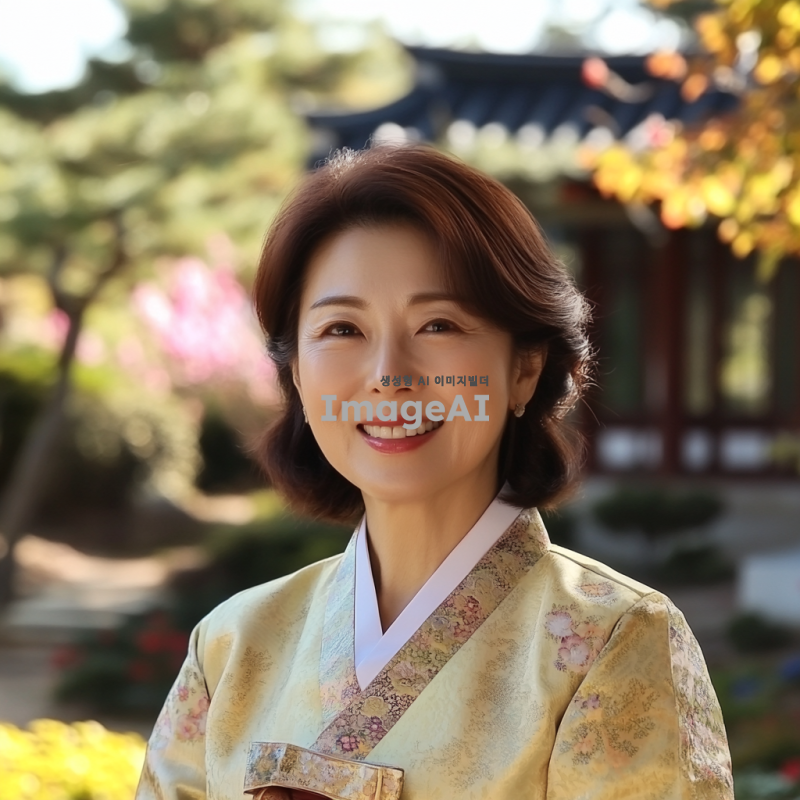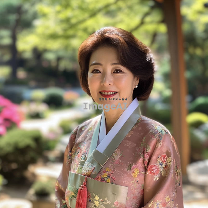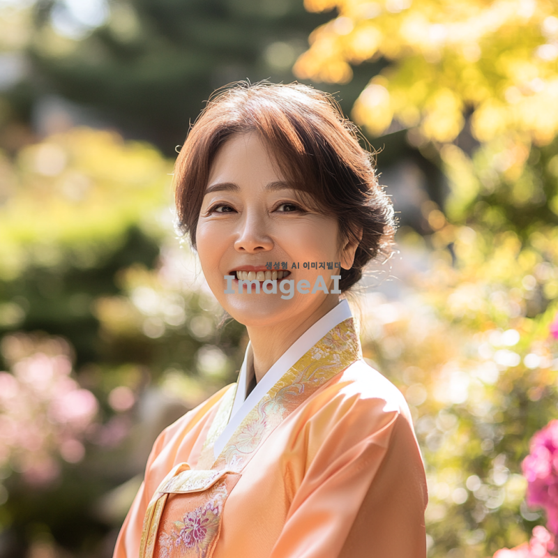 50대 한국인 여성, 자연스러운 미소, 짙은 갈색 머리, 단정한 중간 길이의 헤어스타일, 전통적인 한복 착용, 따뜻하고 친근한 분위기, 밝고 부드러운 조명, 배경은 한국의 전통적인 정원, 꽃과 나무가 어우러진 평화로운 환경.