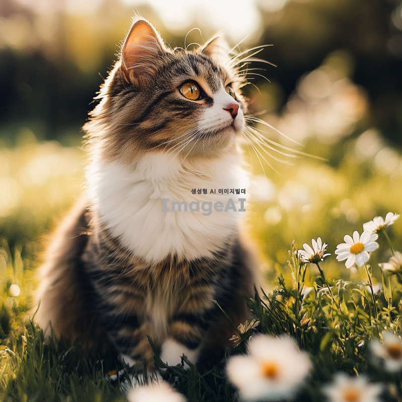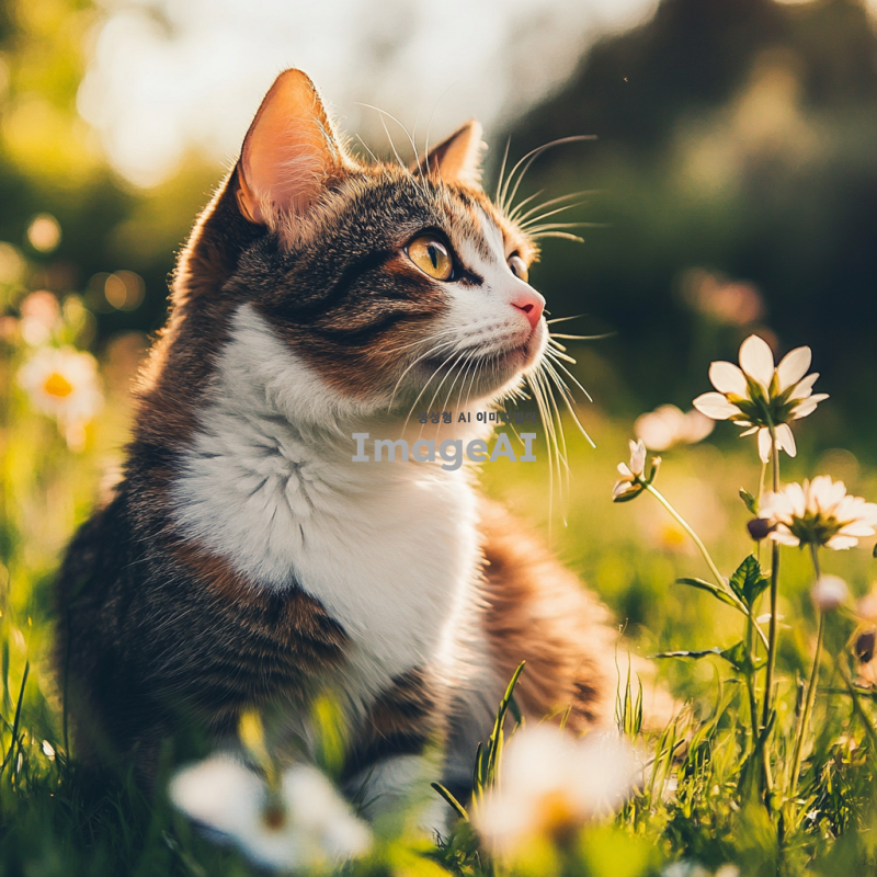 따뜻한 햇살 아래 잔디밭에 앉아 있는 귀여운 고양이, 부드러운 털이 바람에 살랑이는 모습, 밝고 생동감 있는 색감, 고양이의 큰 눈이 반짝이고 호기심 가득한 표정, 주변에는 작은 꽃들이 피어 있는 평화로운 정경.