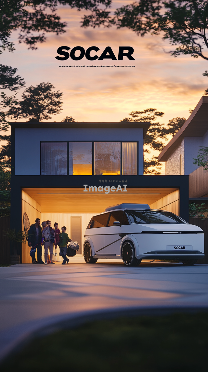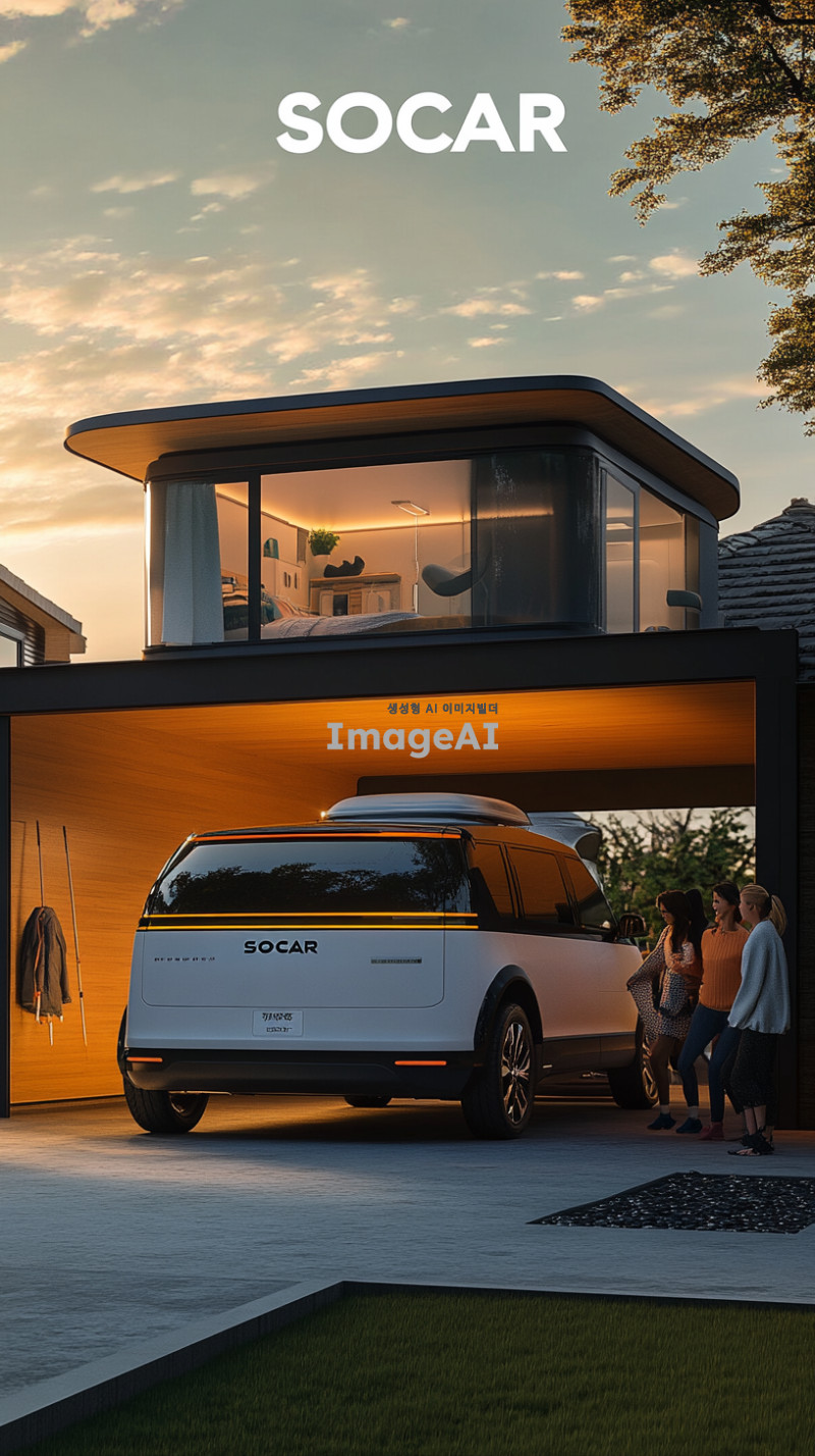 현대적이고 세련된 디자인의 캠핑 자동차, 주택 차고에 주차 되어있는 모습, 주택 차고에 "SOCAR" 적힌 모습, 노을지는 시각, 주변에 다양한 주택과 자연 경관 조화, 깔끔하고 심플한 외부 인테리어, 사용자 친화적인 첨단 기술 장치, 다양한 색상 옵션, 가족과 친구들이 함께 캠핑 짐을 들고 웃는 모습, 자유롭고 행복한 여행에 즐거움을 표현하는 장면.