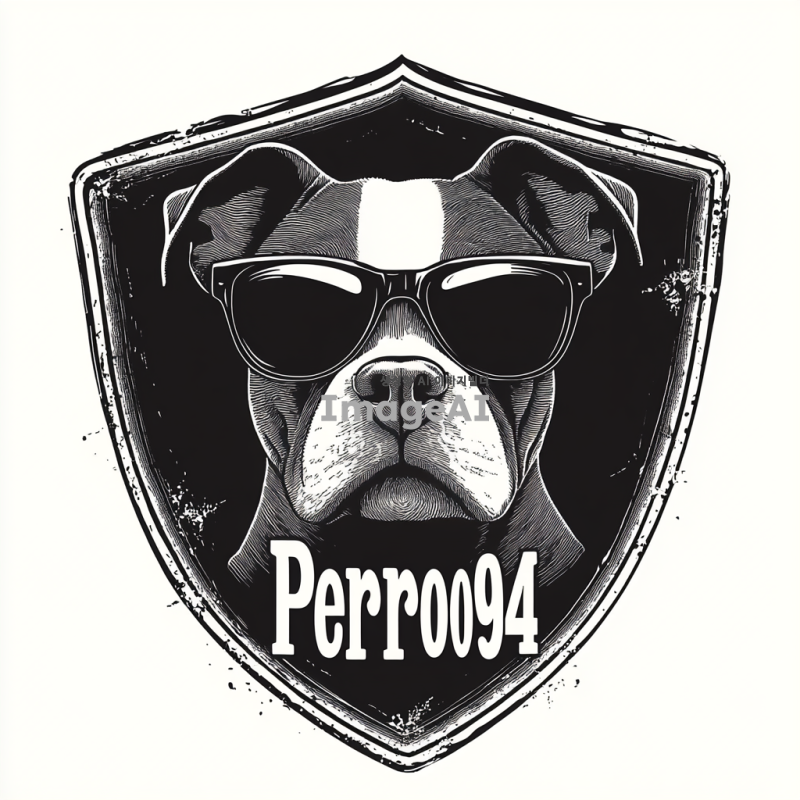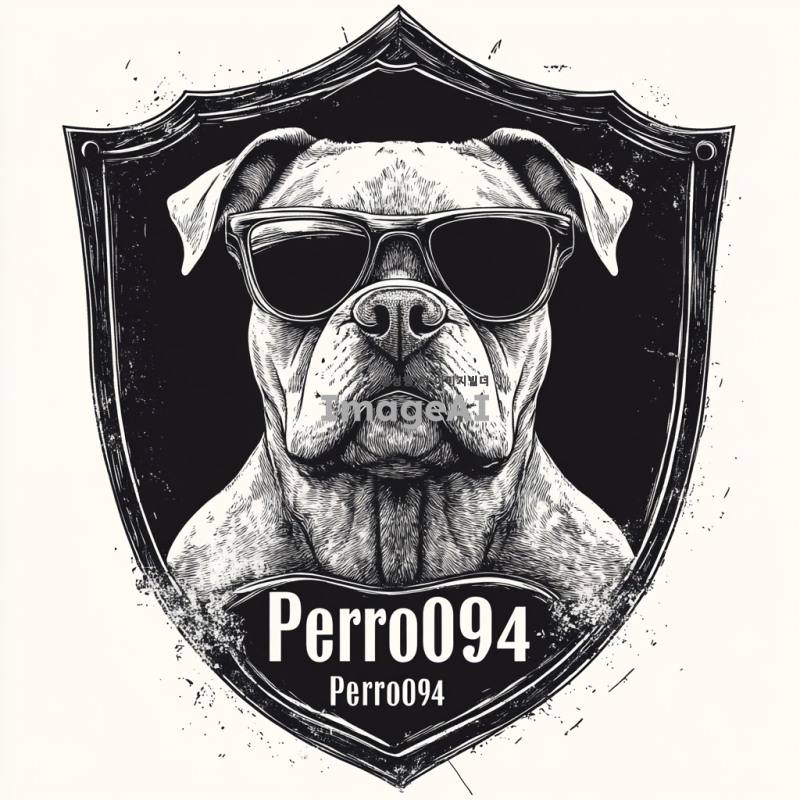 로고는 그래픽 스타일로, "M Perro094"라는 텍스트와 선글라스를 쓴 핏불 강아지,목 근육이 조금 더 크고, 빈티지 방패 모양의 엠블럼 스타일 디자인, 흑백 색상 팔레트, 근육의 세부 묘사가 포함된 디자인입니다.