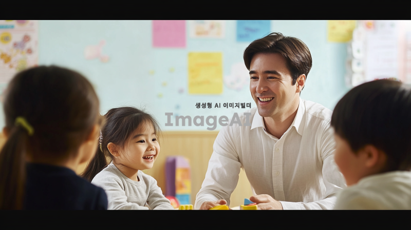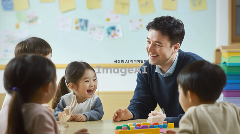 30대 미국인 남성이 한국인 유치원생 5명과 함께 밝은 미소로 대화하는 장면. 남성은 친근하고 따뜻한 인상을 주며, 아이들은 즐겁고 호기심 가득한 표정을 짓고 있다. 배경은 유치원 교실로 꾸며져 있으며, 다양한 색상의 장난감과 학습 도구들이 놓여 있어 활기찬 분위기를 자아낸다. 교실 안은 밝고 따뜻한 조명으로 환하게 비추어져 있다.