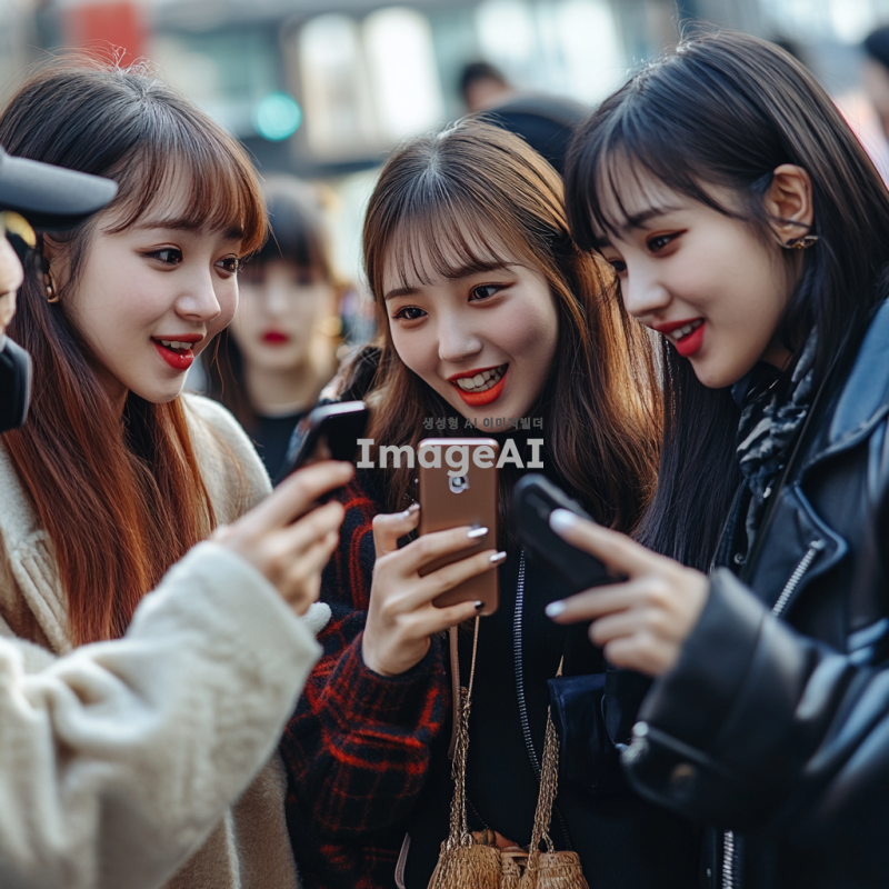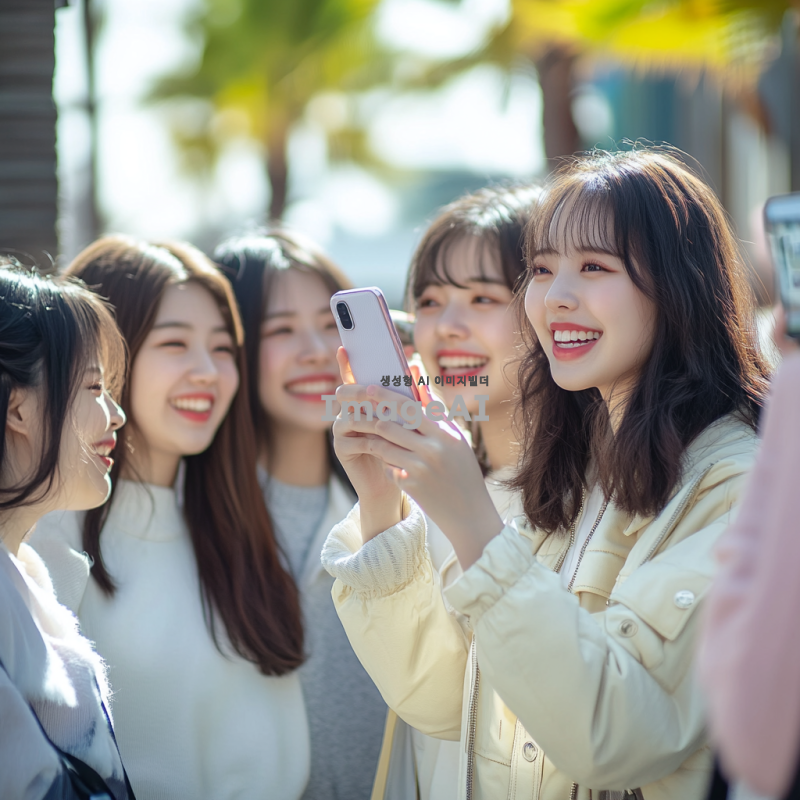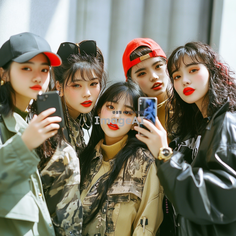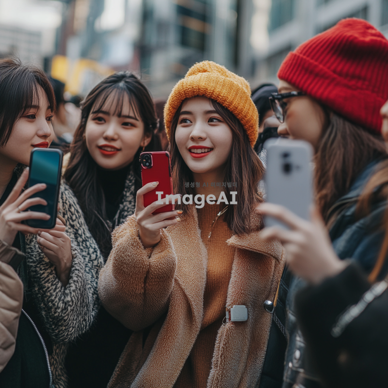 여러 명의 동양인 여성들이 모여 스마트폰 카메라로 사진을 찍고 있는 장면, 각기 다른 스타일의 캐주얼 옷차림을 하고 있으며, 자연스럽고 즐거운 분위기, 왼쪽 얼굴 위주로 취한 포즈, 다양한 헤어스타일과 액세서리, 현대적이고 세련된 도시 배경.