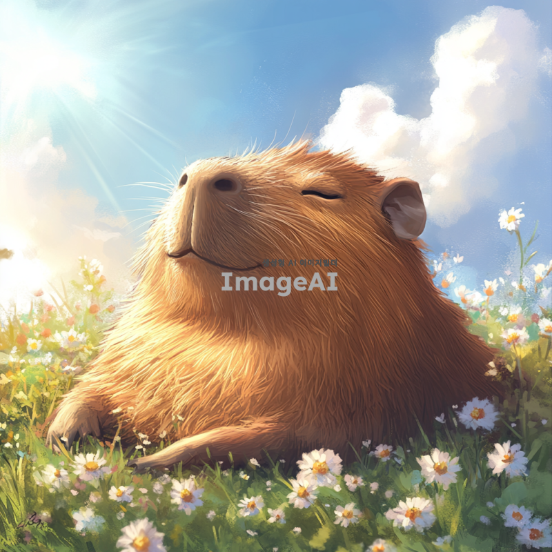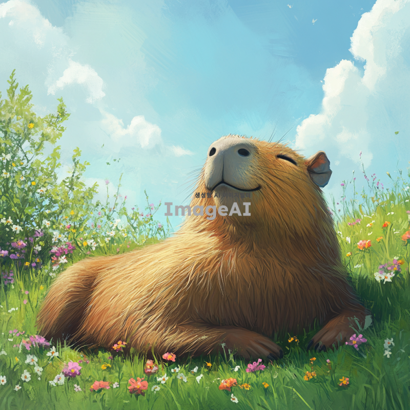 귀여운 카피바라가 푸른 초원에서 편안하게 누워 있는 모습, 주변에는 작은 꽃들이 피어 있고, 따뜻한 햇살이 비치는 평화로운 풍경. 카피바라는 부드러운 갈색 털을 가지고 있으며, 눈을 감고 미소 짓고 있는 모습. 배경에는 푸른 하늘과 흰 구름이 떠 있는 장면.